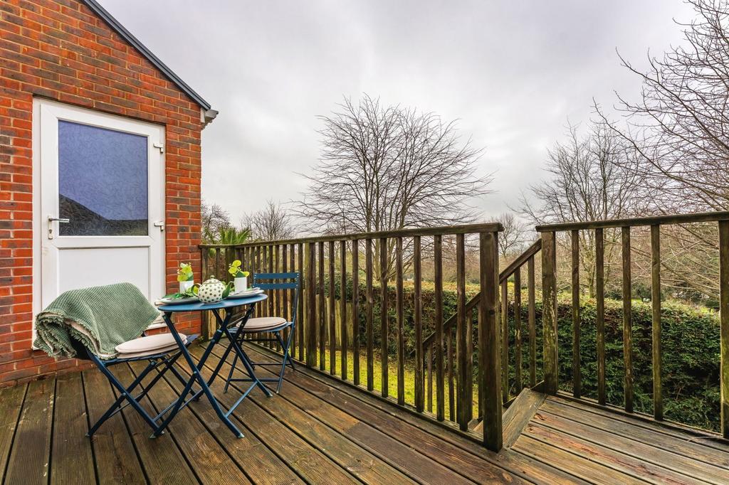 To the rear, the garden is fully enclosed and arranged for ease of maintenance. Immediately outside the lounge, a decked terrace provides an excellent spot for al fresco dining, entertaining, or enjoying a quiet morning coffee. Steps lead down to a further garden area, mainly laid to lawn.