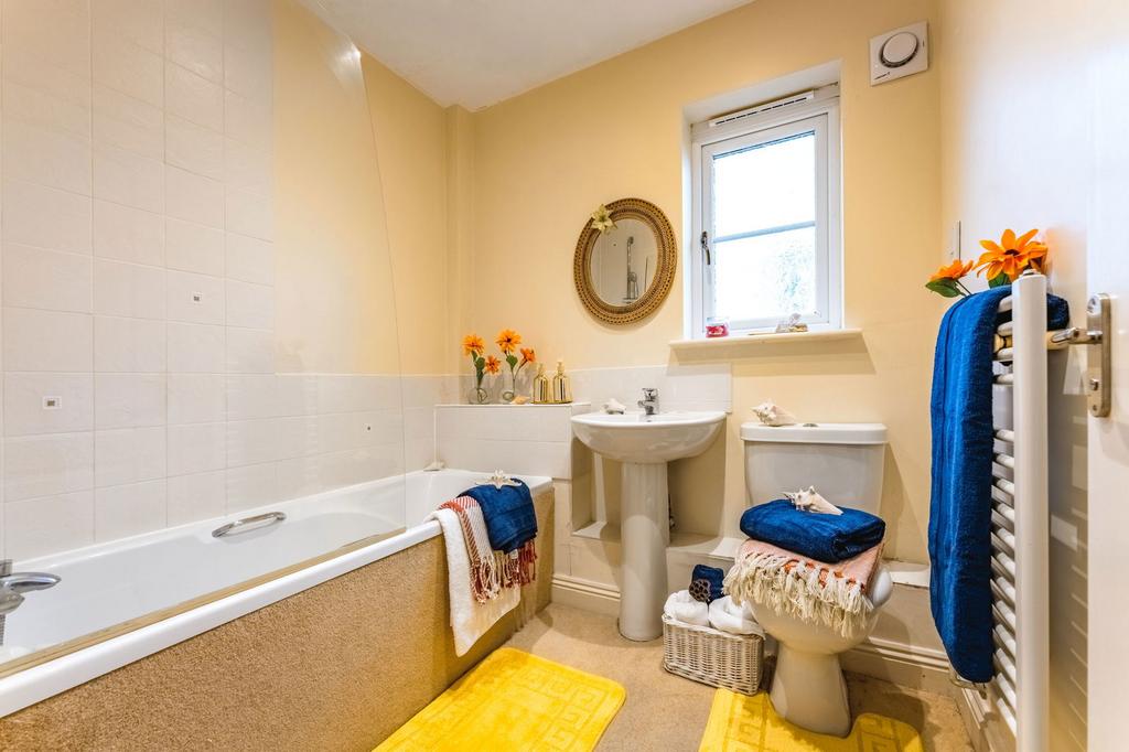 The bathroom is accessed both from the landing and directly from bedroom two, and is fitted with a white suite comprising WC, wash hand basin with mixer tap, heated towel rail, and a panelled bath with shower attachment and glass screen.