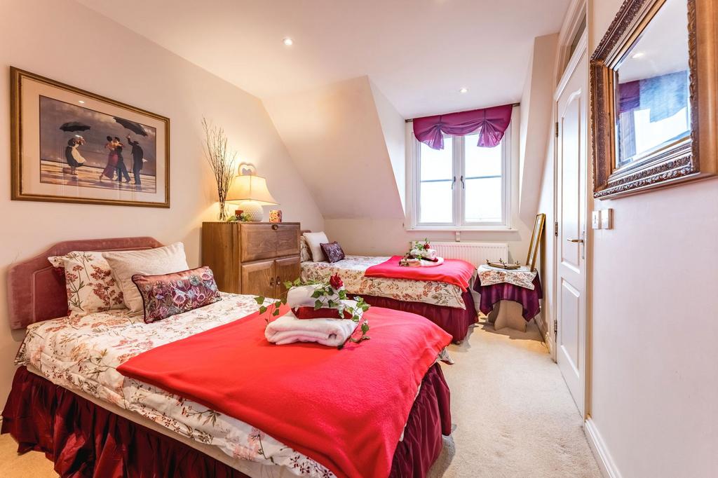 The first floor offers two bedrooms and a well‑appointed Jack & Jill bathroom. Bedroom two is a particularly attractive dual‑aspect room, with a door opening to a Juliet balcony providing glimpses of the sea — a lovely reminder of the coastal setting.