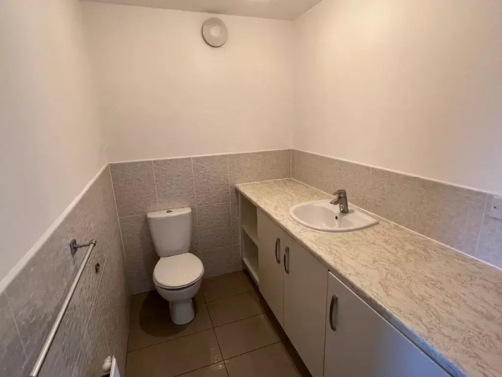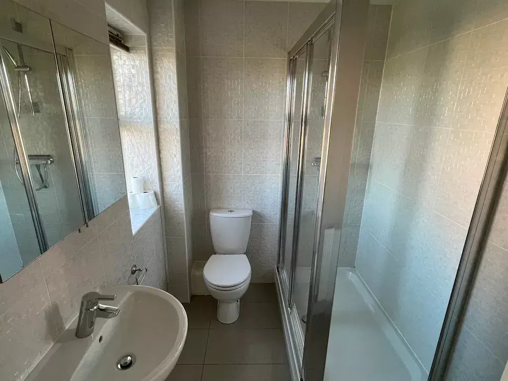 With frosted double glazed window to the front elevation, fitted with a suite comprising of: shower cubicle with mains powered shower, push button wc, wash hand basin, mirror fronted vanity unit and single panel heatingradiator. Decorated with fully tiled walls.