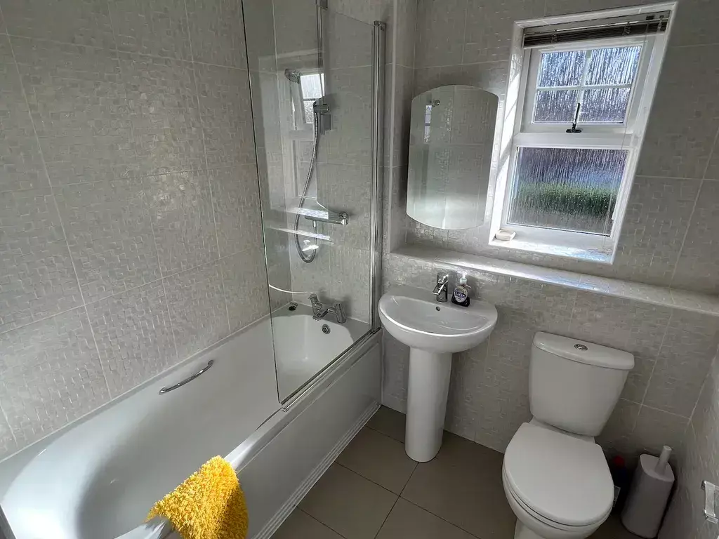With frosted double glazed window to the rear elevation, fitted with a suite comprising of: panelled bath with glass shower screen and mains powered shower, push button wc, wash hand basin, single panel heating radiator and mirror fronted vanity unit. Decorated with fully tiled walls.