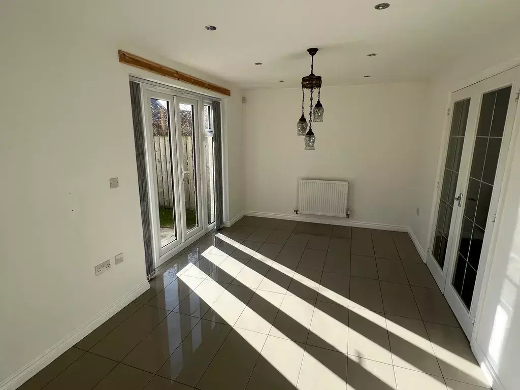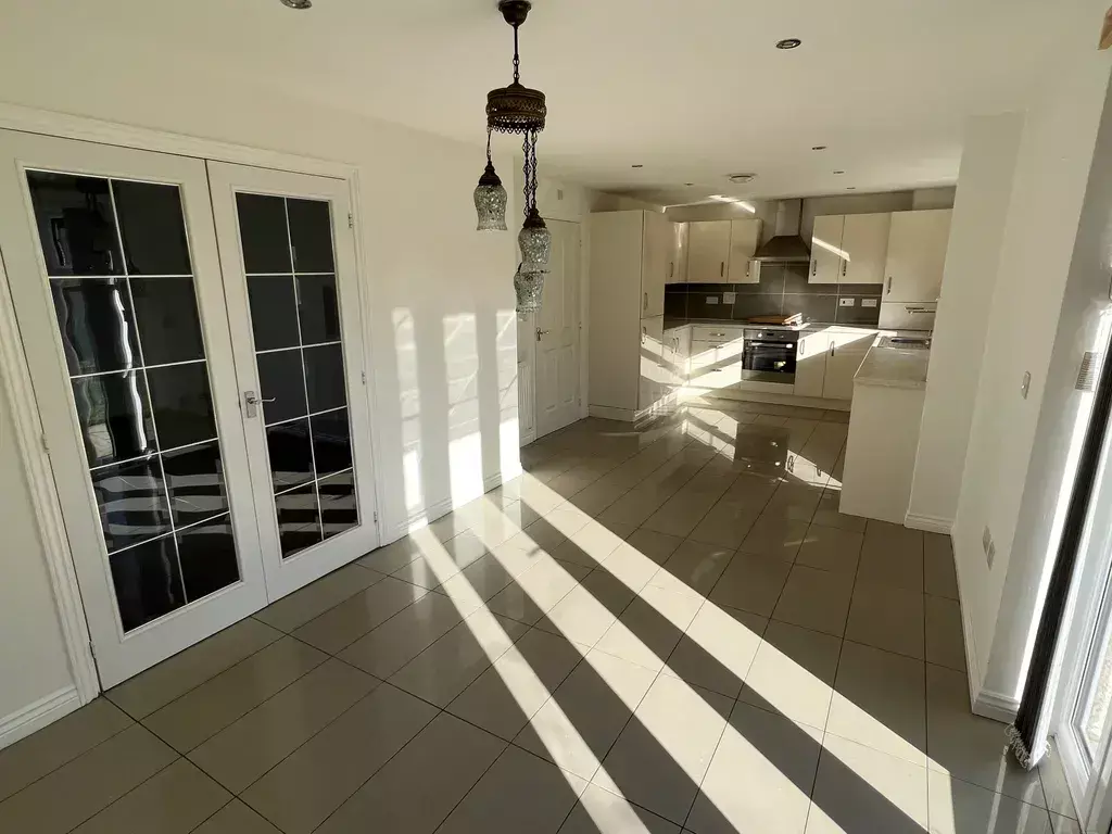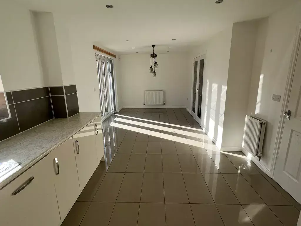 With double glazed window and double glazed French doors both to the rear elevation, fitted with a contemporary range of wall and floor mounted units with contrasting laminate working surfaces incorporating stainless steel drainer sink unit with mixer tap, integrated oven and hob with stainless steel canopy style extractor, integrated fridge freezer, integrated dish washer, Ideal Logic heating boiler and two double panel heating radirators. Decorated with part tiled and colour washed walls.