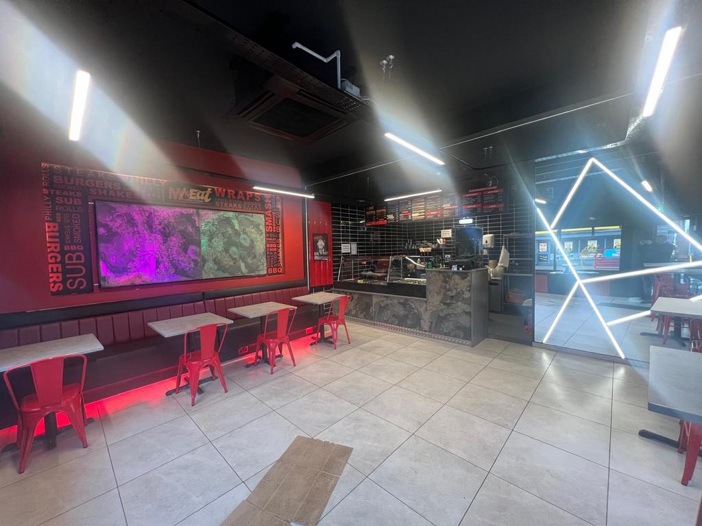 The premises has undergone a comprehensive refurbishment, fitted with brand-new windows, doors, and secure roller shutters for peace of mind. Safety is prioritised through an advanced CCTV set-up and integrated security and fire alarm systems. Inside, a welcoming front seating area awaits, complete with tables and chairs ideal for quick bites or group meals.