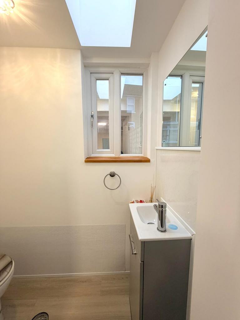 The ground floor also features a bright and contemporary W.C, flooded with natural light from both a window and a feature skylight. It comes complete with a modern vanity unit and stylish chrome fittings.