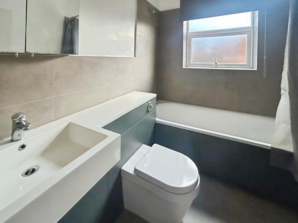 The principal bedroom is larger than average and benefits from a large sash window, allowing plenty of natural light. A second well-proportioned bedroom offers flexibility for guests, home working or additional storage. The modern bathroom features a designer-style white suite, including a bath with shower over, WC and separate hand basin, finished with contemporary tiling.