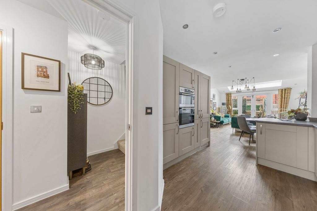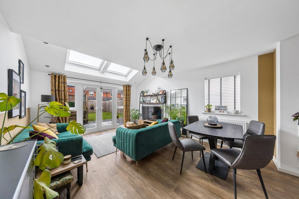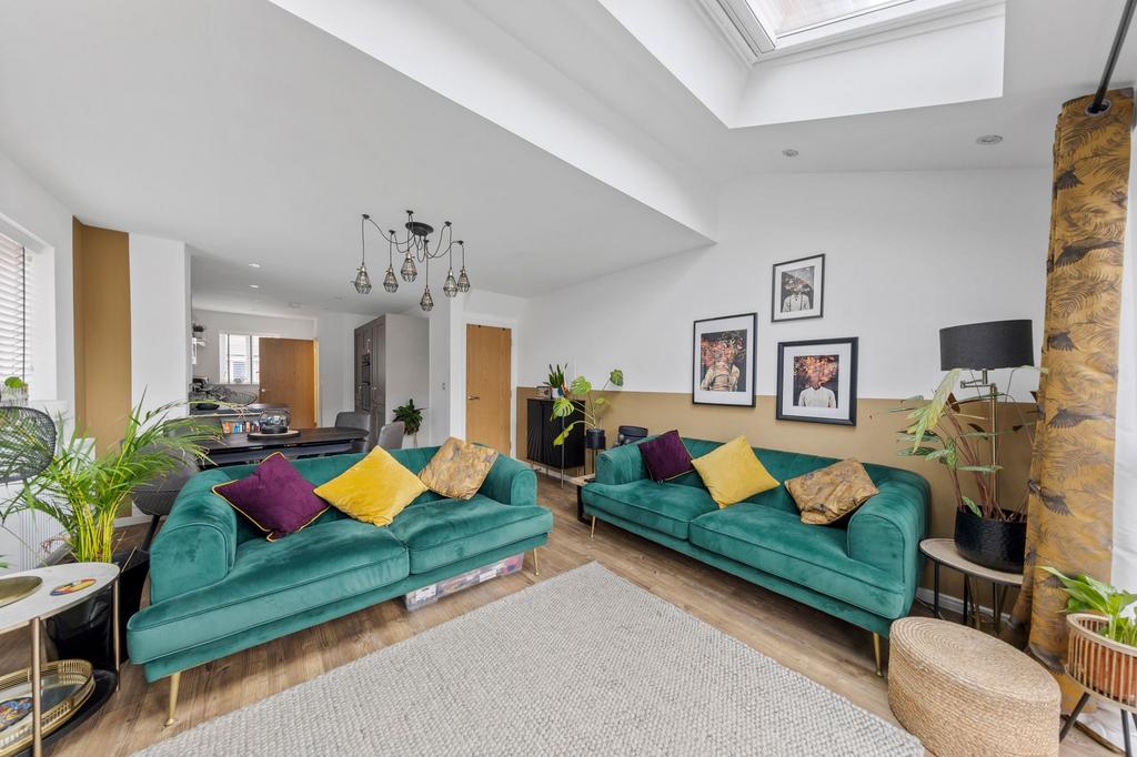 As you step into the property through the welcoming entrance hallway, you are immediately struck by the sense of space and flow that defines the ground floor. The hallway naturally leads you into the impressive kitchen diner, a beautifully proportioned room that extends the full length of the property and forms a central hub for everyday living. The kitchen itself is thoughtfully designed, offering an abundance of worktop space and storage, complemented by a range of integrated appliances that provide both practicality and a clean, modern finish. From the kitchen, the accommodation opens seamlessly into the stunning living and dining area, which truly serves as the heart of the home. This versatile space comfortably accommodates a generous dining table, creating the perfect setting for family meals, dinner parties, or social gatherings. Beyond the dining area, the room transitions effortlessly into a relaxed lounge space, ideal for unwinding at the end of the day. This area is particularly impressive, featuring a striking vaulted ceiling that adds a wonderful sense of height and character. Velux windows are thoughtfully positioned to allow natural light to pour in throughout the day, enhancing the bright and airy feel, while French doors open directly onto the garden, creating a strong connection between indoor and outdoor living. Completing the ground floor is a conveniently located and well-presented W/C.