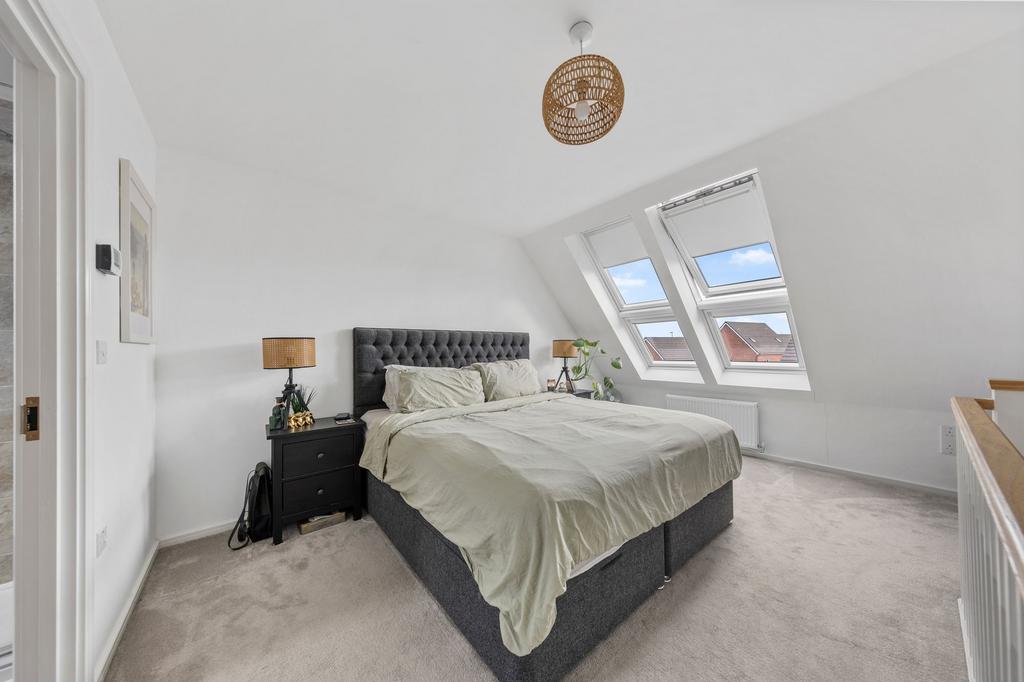 Ascending to the first floor, the accommodation continues with two beautifully presented bedrooms, both finished to an excellent standard and offering generous, versatile proportions that comfortably suit adults, children, or home-working needs. Each room enjoys a calm and welcoming atmosphere, enhanced by tasteful décor and an abundance of natural light. Also located on this level is the impressive three-piece family bathroom, which is thoughtfully designed and luxuriously appointed. It features a bath with a shower over, complemented by attractive built-in shelving within the shower area, providing both practicality and a touch of contemporary style. The second floor is dedicated entirely to the principal bedroom suite, creating a private and peaceful retreat separate from the rest of the home. This outstanding space is enhanced by large Velux windows that allow natural light to pour in throughout the day, resulting in a bright, open, and airy feel. The room is exceptionally well arranged, benefitting from excellent integrated storage solutions that maximise space and provide superb organisation. Completing this floor is the private en-suite bathroom, finished to a high standard and featuring a stylish sunken shower tray, adding a sense of luxury and comfort to this impressive bedroom suite.