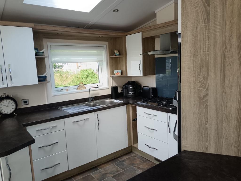 Inside, the lodge features a bright and stylish open-plan lounge and dining area, ideal for both quiet evenings and hosting friends and family. The space is beautifully proportioned and flooded with natural light.