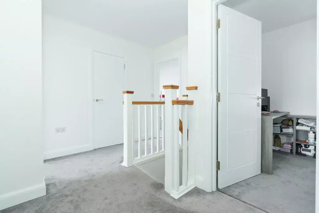 Upstairs offers four generously sized bedrooms, with the principle bedroom enjoying stylish fitted wardrobes and a luxurious en-suite bathroom. A contemporary family bathroom serves the remaining bedrooms.