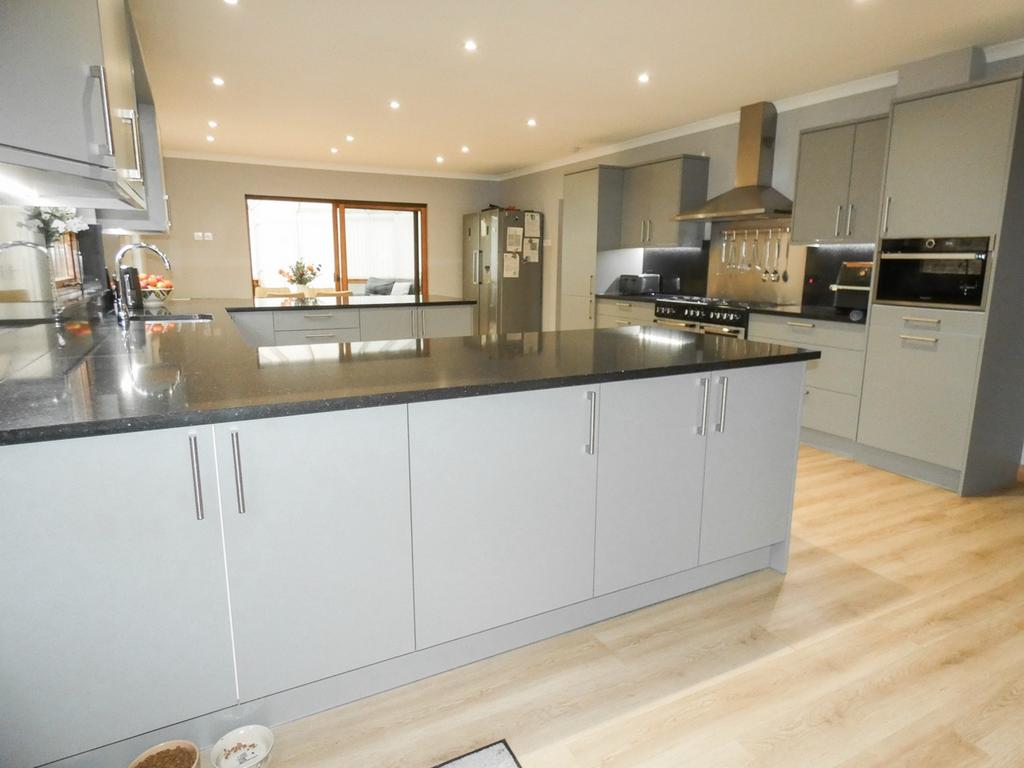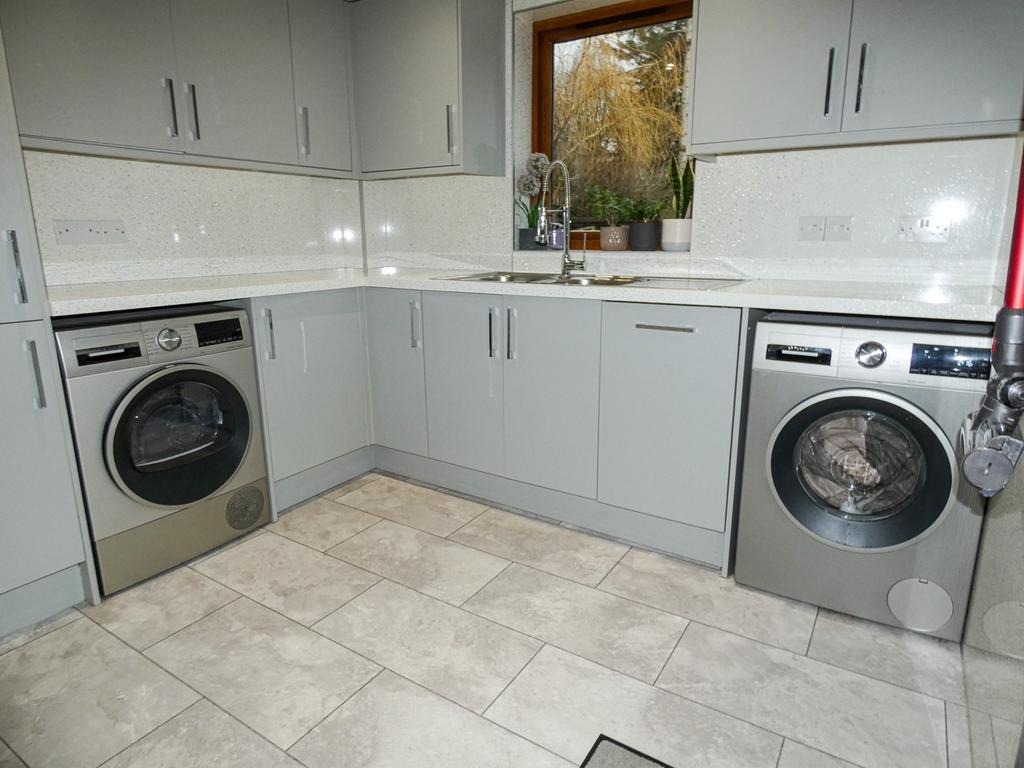 Fitted wall and base units with double sink unit and an integrated dishwasher. Wet wall panels to all walls. Click vinyl floor tiles. Rear door out.