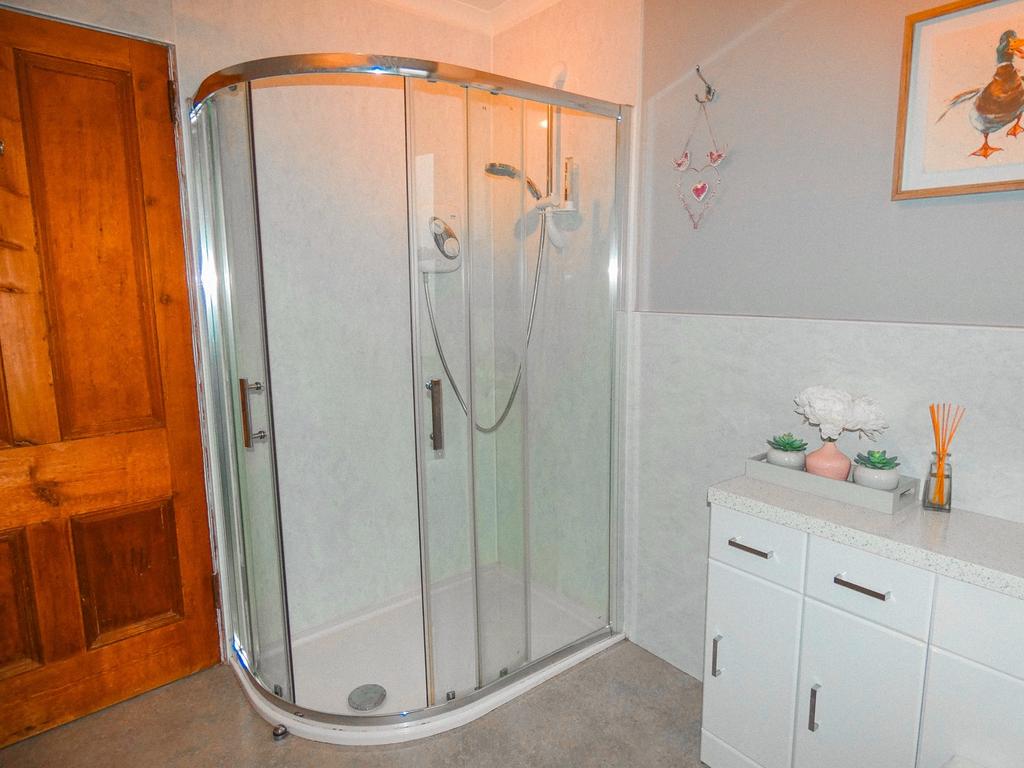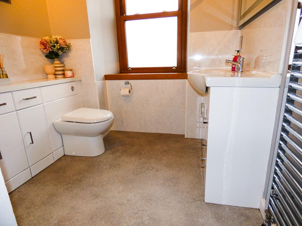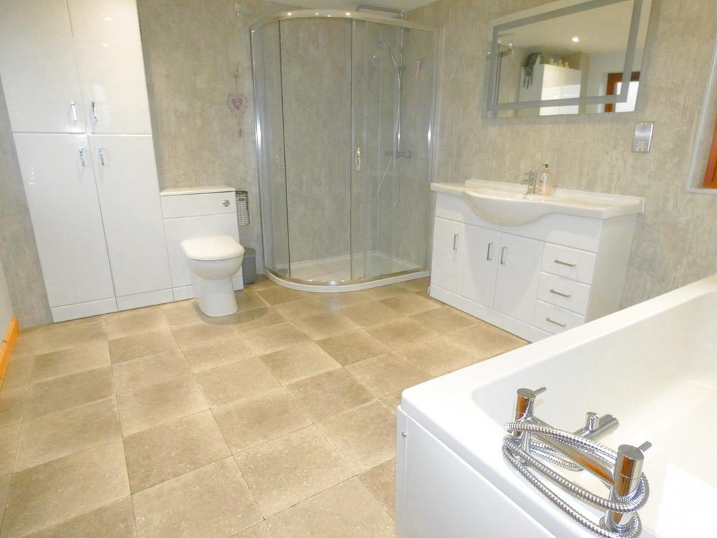 cubicle. Bathroom with mixer shower. Wet wall panels on three walls. Heated towel rail. Window to the side of the
