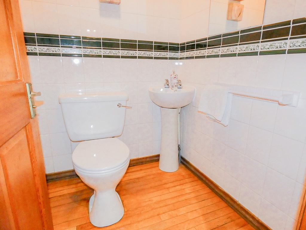 White WC and small corner sink unit. Extractor fan. Wooden floor. Tiled walls.