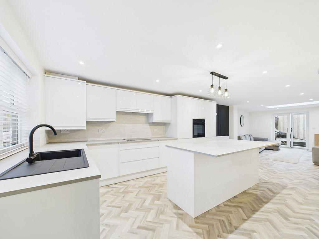 Upon entering the property, you are welcomed into a modern, high gloss, fully fitted kitchen, complete with a central island that is ideal for use as a breakfast bar. The kitchen is equipped with integrated appliances including: oven, hob, extractor, fridge freezer and washing machine. The kitchen opens into a spacious open-plan lounge, featuring both patio doors and a skylight, allowing an abundance of natural light to flood the space. This light and airy area also benefits from a downstairs WC, providing convenience.