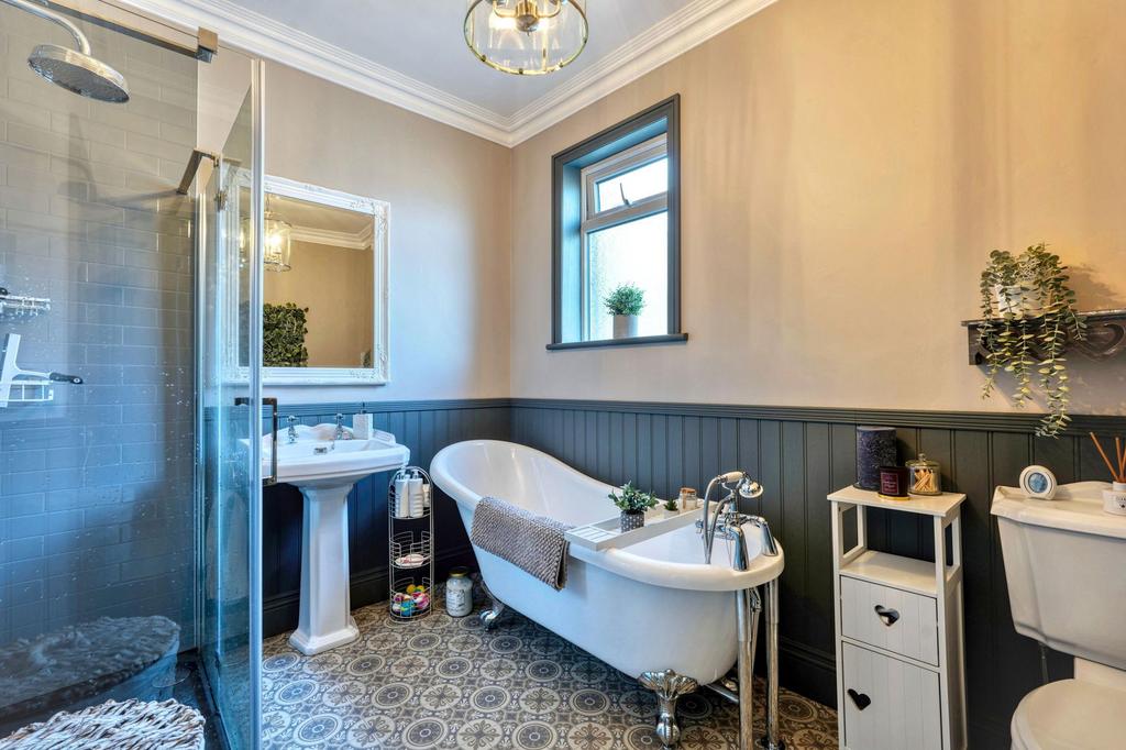- Gorgeous four-piece bathroom with a clawfoot rolltop bath and separate rainfall shower