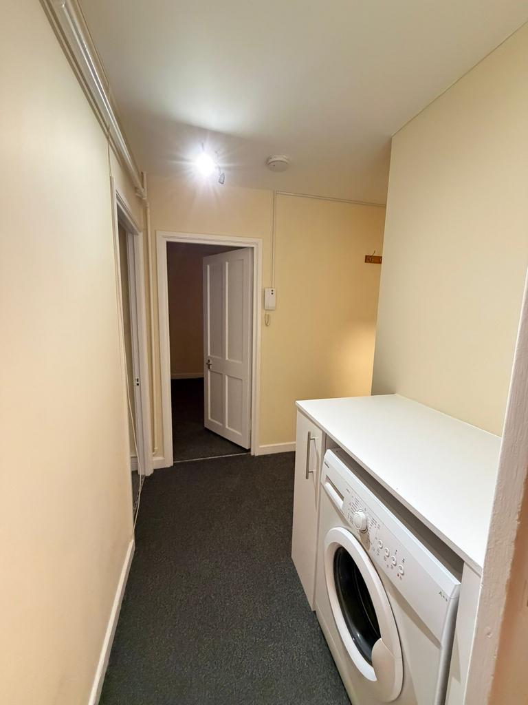 Fitted kitchen with cupboards and counter space, and generous storage in the corridor.