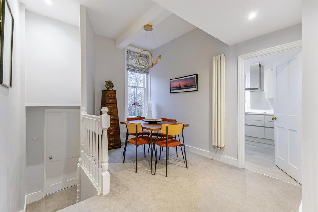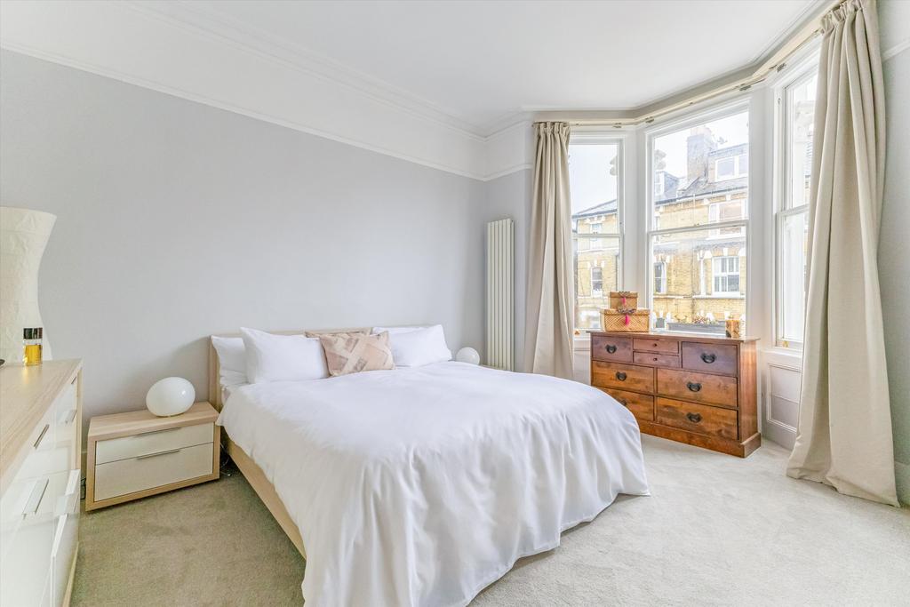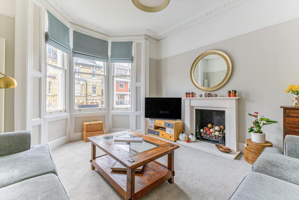 Upon entering, a generous hallway with a large sash window immediately introduces the apartment’s sense of space and natural light. The reception room is equally bright and inviting, featuring expansive sash windows and original Victorian cornicing, creating an ideal atmosphere for relaxing evenings or entertaining guests. The separate, modern kitchen is fitted with high‑quality appliances and sleek worktops, offering a stylish and functional space for cooking.