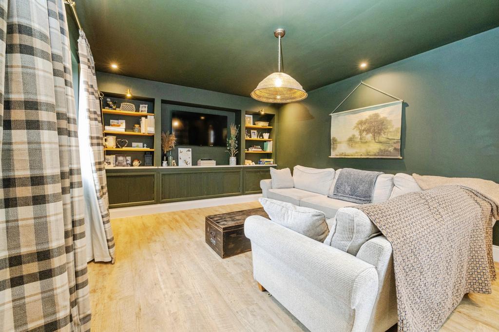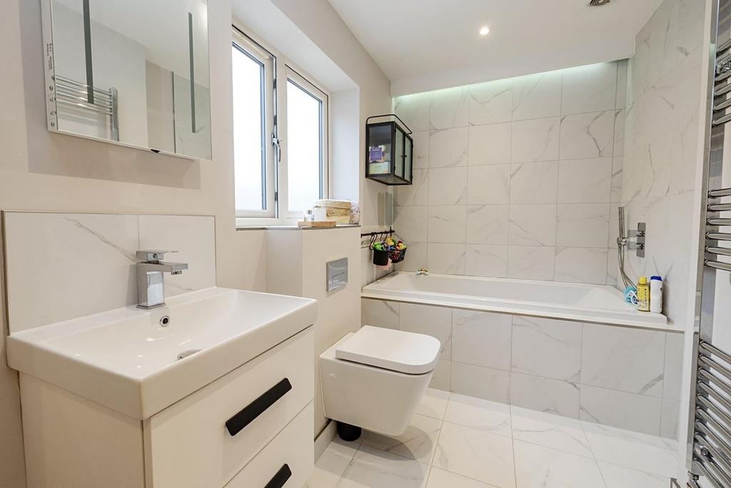 The well-designed accommodation comprises an inviting entrance hall with staircase, a spacious living room enjoying dual-aspect windows, and a stunning open-plan kitchen/dining room. The bespoke modern kitchen features a comprehensive range of wall and base units with quartz worktops, integrated Neff appliances, and a central island—ideal for entertaining. Bi-fold doors open directly onto the rear garden, seamlessly connecting indoor and outdoor spaces. A cloakroom/WC completes the ground floor, which benefits from underfloor heating throughout.