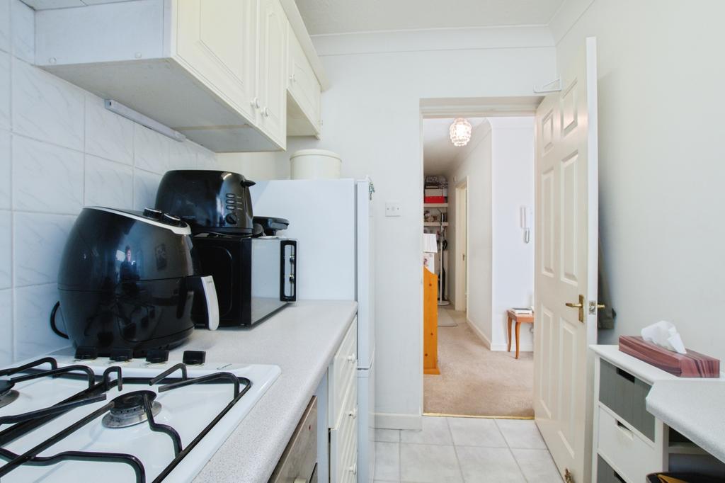 Inside, the property feels bright and spacious. The south facing lounge opens directly onto the terrace, creating a lovely flow for relaxing or entertaining. The kitchen offers ample storage, a fitted oven and hob, and space for appliances.