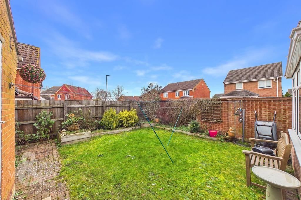 The private part walled rear garden offers a good degree of privacy with lawned section surrounded by raised planting beds well stocked with mature shrubs. There is a paved patio area and pathway leading to the garage which has been partially converted to create storage/hobby space. Beyond the garage is a timber built storage shed and there is a side gate leading onto the drive also.