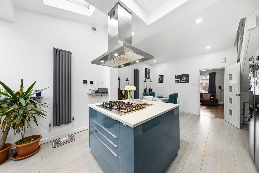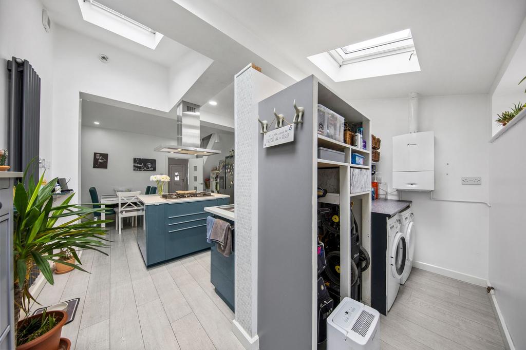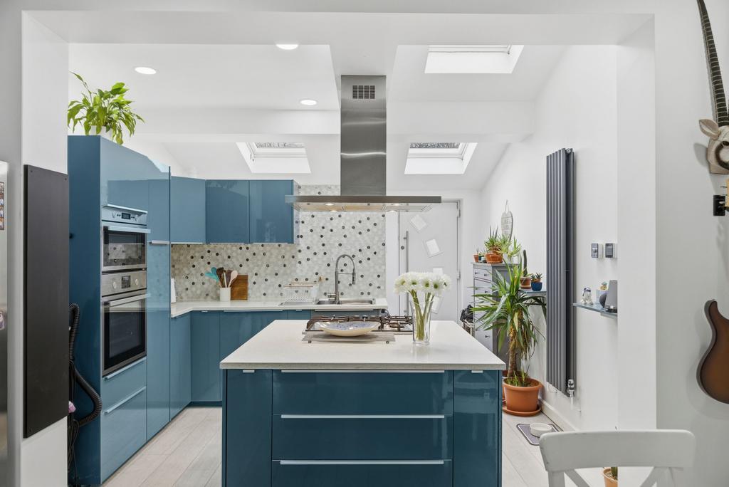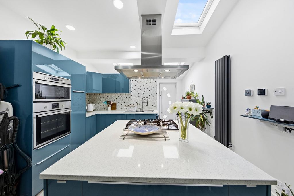 The property was extended approximately seven years ago, creating a modern and functional living space. The kitchen and dining area have been tastefully modernized, featuring a sleek fitted kitchen with integrated dishwasher, quartz worktops, oven, and microwave, all of which are included in the sale. Three electric Velux windows flood the space with natural light, enhancing the bright and contemporary feel.