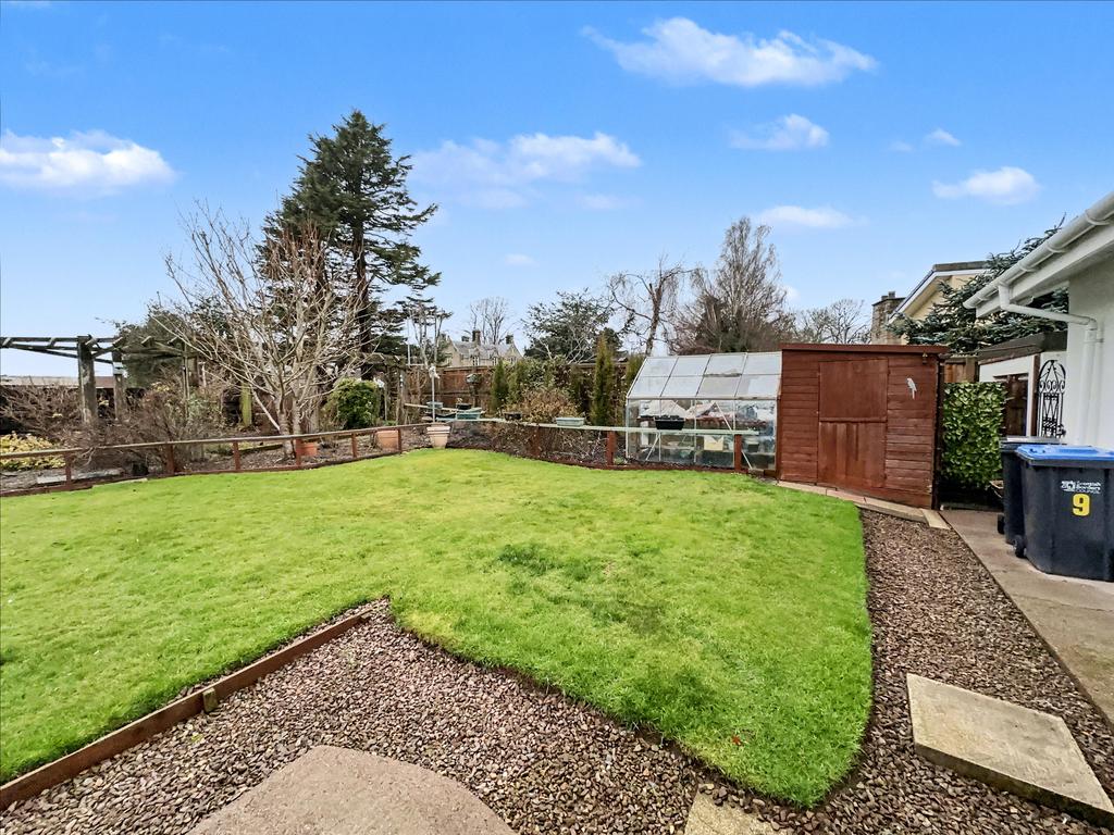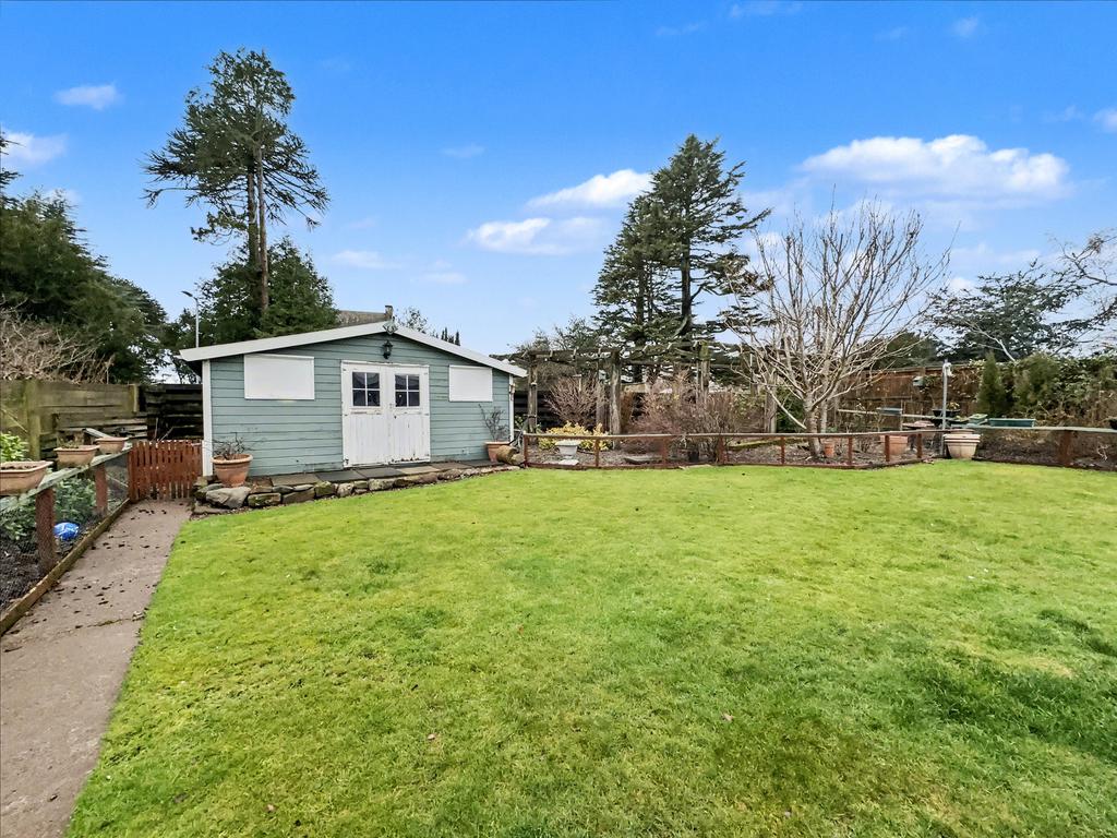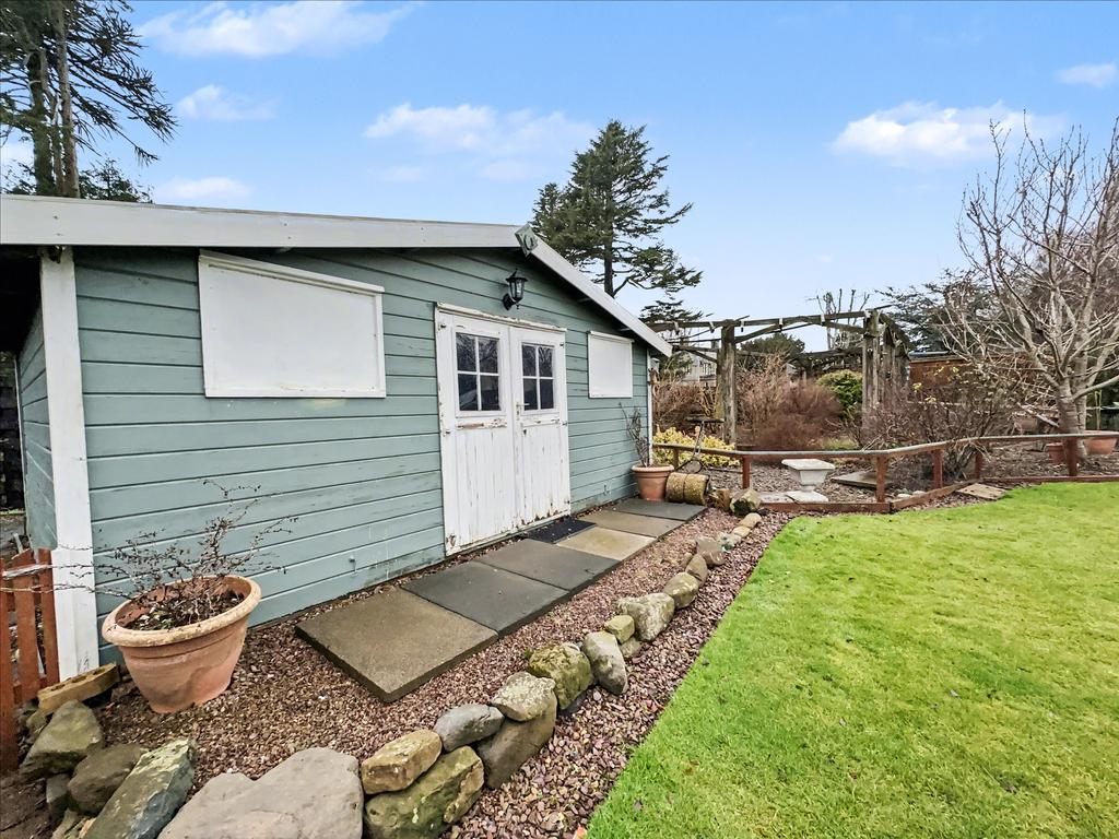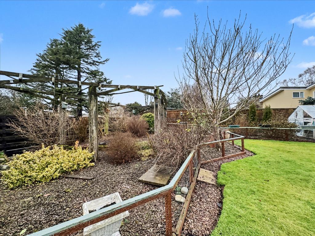 The property is set back from a small cul-de-sac and features a well-tended, low-maintenance front garden with gravelled areas and planted trees, heathers and shrubs. There is driveway parking for several vehicles, leading to a single detached garage. To the rear, the enclosed garden offers a good level of privacy and enjoys afternoon and evening sunshine. The conservatory is ideally positioned to make the most of the summer evenings. The rear garden is mainly laid to lawn with planted borders and includes a large workshop/summer house.