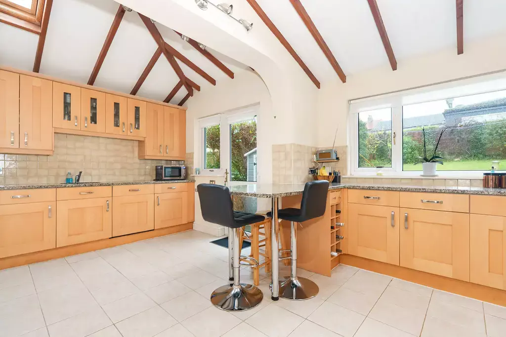 - Modern dining kitchen enjoying a feature ceiling height with beams, utility room off and integral access to the garage