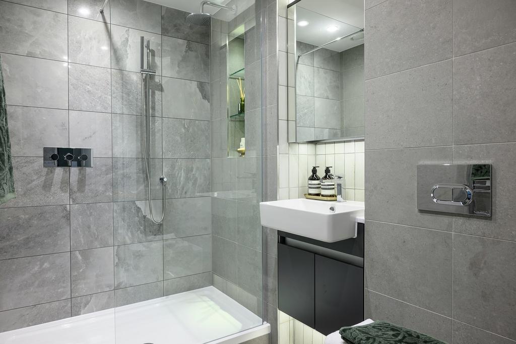 chrome-effect electric towel rail with thermostatic valve control, tiled flooring, and a fitted vanity unit complete with shelving and integrated strip lighting , perfect for curating your own sanctuary at home.Balcony