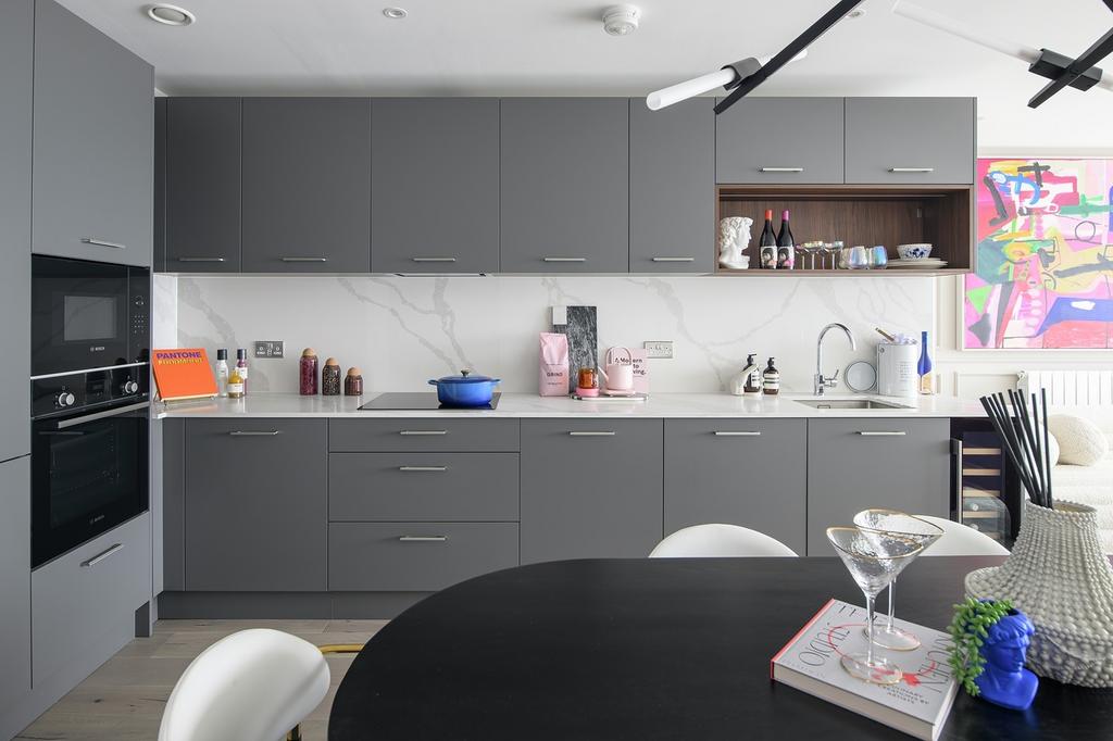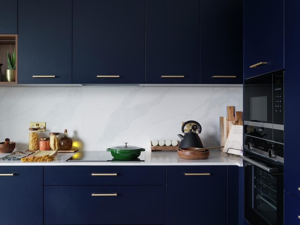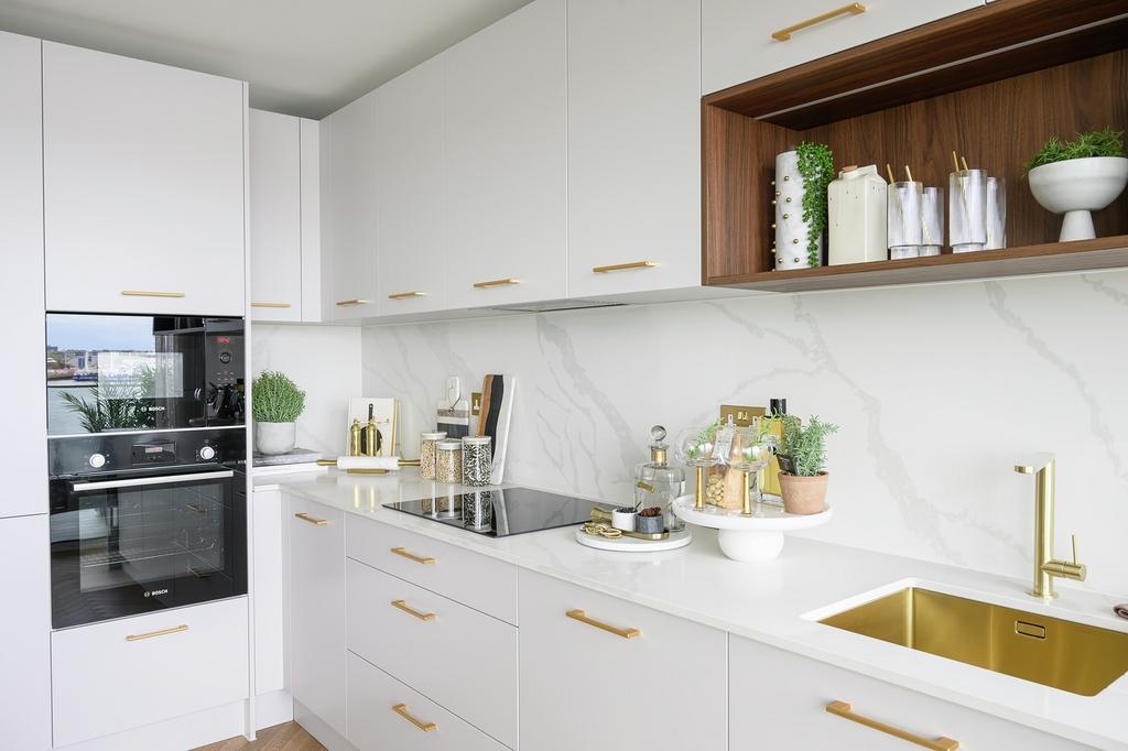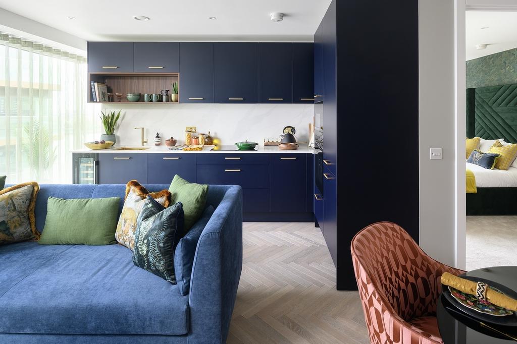Each block offers individually designed layouts with half-height wall units and internal shelving in light or dark colour palettes. Kitchens feature full-height porcelain stoneware splashbacks, quartz worktops, and an undermounted stainless-steel sink. Lighting includes energy efficient downlights and under-unit strips, paired with herringbone patterned timber-effect flooring. Integrated appliances include a ceramic hob, extraction hood, Bosch oven with air-fry function, fridge-freezer, dishwasher, and a wine cooler.