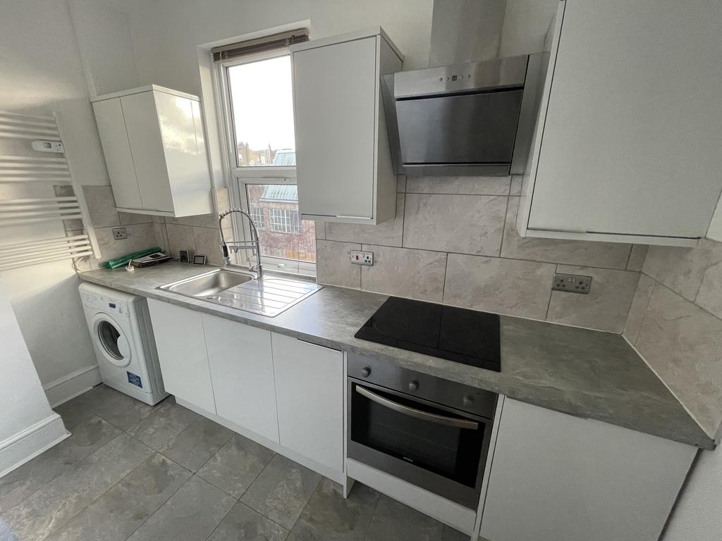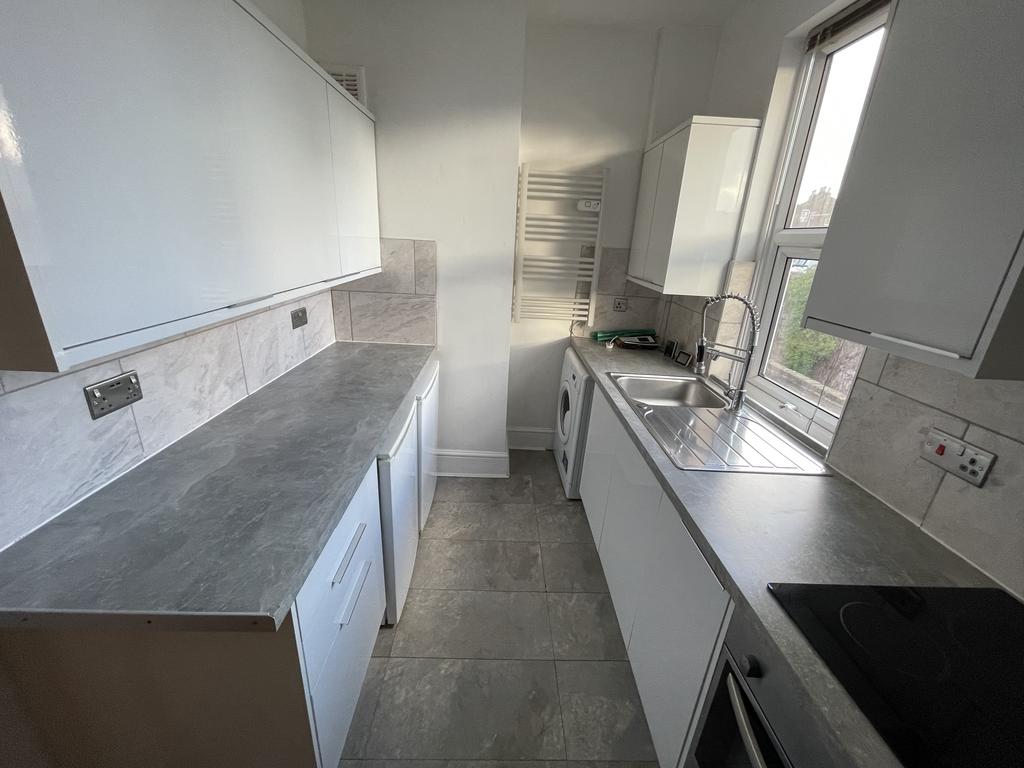 The property features a bright living area, a modern fitted kitchen, and a contemporary bathroom. The flat further benefits from a private terrace, ideal for outdoor space in an urban setting.