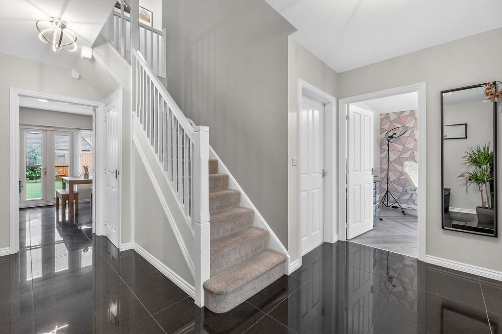 From the moment you arrive, the sense of space and quality is immediately apparent. A large and welcoming entrance hall creates an impressive first impression and provides access to almost all ground floor rooms, reinforcing the home’s executive feel. The principal reception room is a substantial lounge positioned to the rear of the property, flooded with natural light and featuring patio doors that open directly onto the garden, making it perfect for both everyday relaxation and entertaining guests.