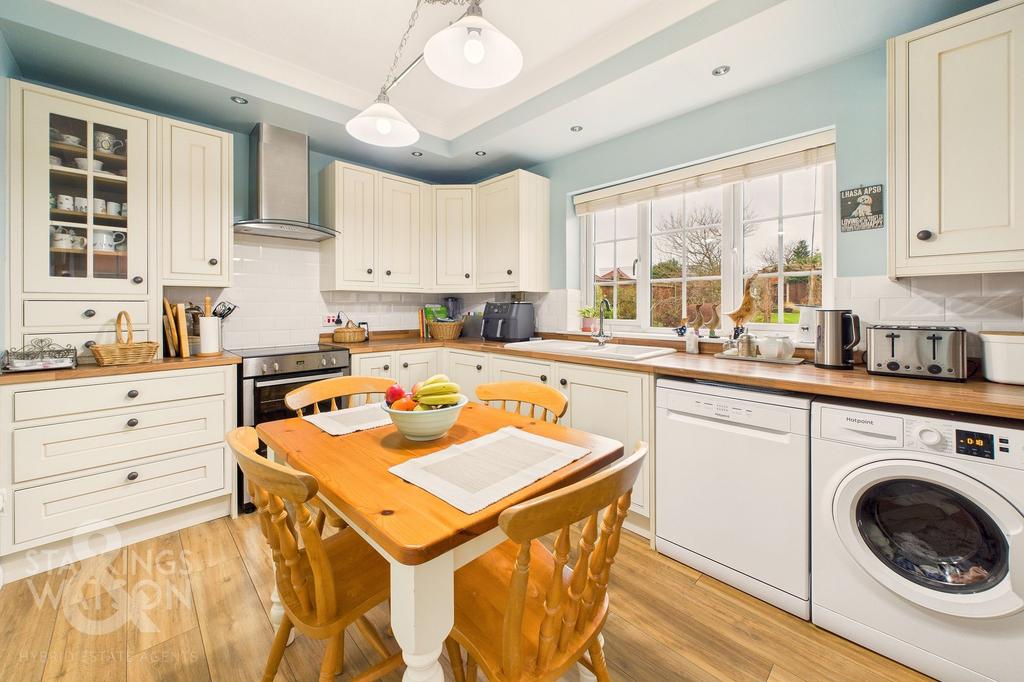 Stepping inside, the spacious hallway features stairs rising to the first floor with useful integrated storage beneath and a conveniently located two piece W.C. Carpeted flooring runs underfoot, continuing into the first of the home's reception rooms. The 15’ dining room features a bay window to the front, ensuring the space enjoys plenty of natural light, and is centred around a charming feature fireplace. There is ample room for a large formal dining table, while the adjacent sitting room offers a cosier feel with continued carpeted flooring and another feature fireplace. Here, uPVC double glazed French doors open directly onto the patio, creating a seamless transition from inside to out during the summer months. Across the hallway, the fully fitted kitchen offers a range of wall and base storage cupboards with generous worktop space for food preparation, finished with tiled splashbacks for ease of maintenance. Under counter space is available for a dishwasher and washing machine, with further room for an ‘American style’ fridge freezer. A highlight of the space is the inset ceramic sink with mixer tap, positioned below the window, whilst a further door leading out to the side of the property.