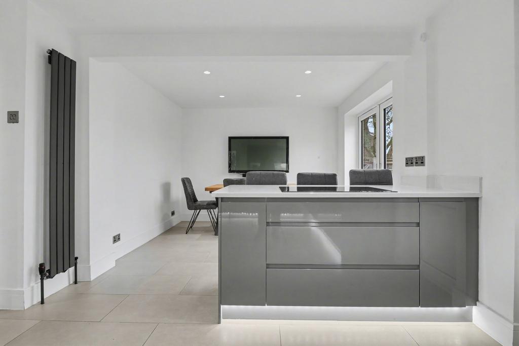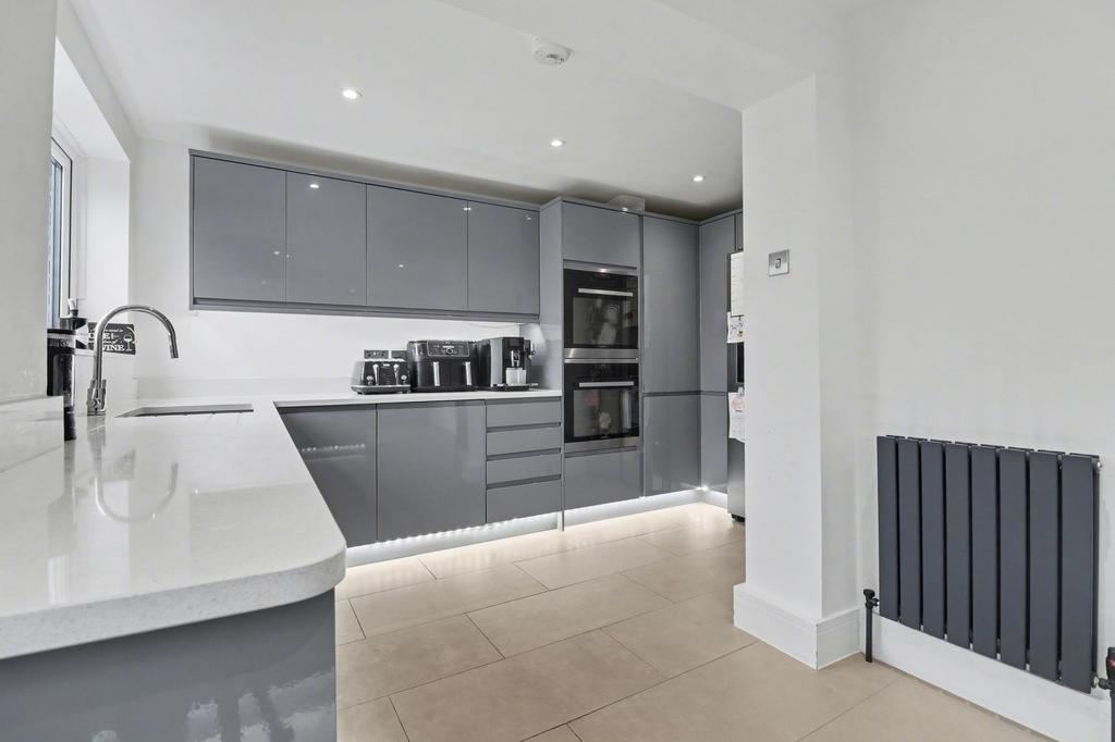 To the rear lies the true heart of the home—an impressive open-plan kitchen, dining, and family area. The kitchen is fitted with a sleek range of contemporary high-gloss units, complemented by quartz work surfaces and a substantial central island providing additional storage and informal seating. Integrated appliances and under-unit lighting enhance both the practicality and visual appeal of this superb space. The layout flows seamlessly into the dining and family area, which is flooded with natural light via rear-facing windows and doors—perfect for entertaining and everyday living.