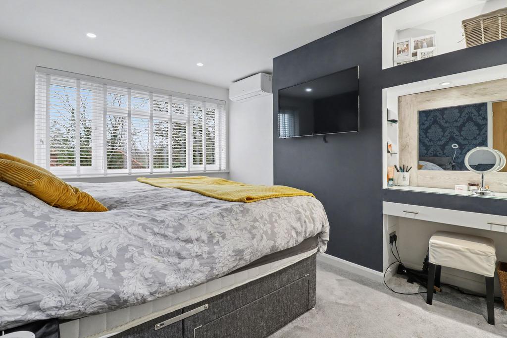 Upstairs, the property offers well-proportioned bedrooms, all presented to a high standard. The principal bedroom enjoys a stylish finish and ample space for furniture, while the remaining rooms offer superb versatility for use as children’s bedrooms, guest accommodation, or a home office. The family bathroom features a white suite with soft-toned tiling, creating a bright and functional space. A separate shower room further enhances the practicality of the accommodation.