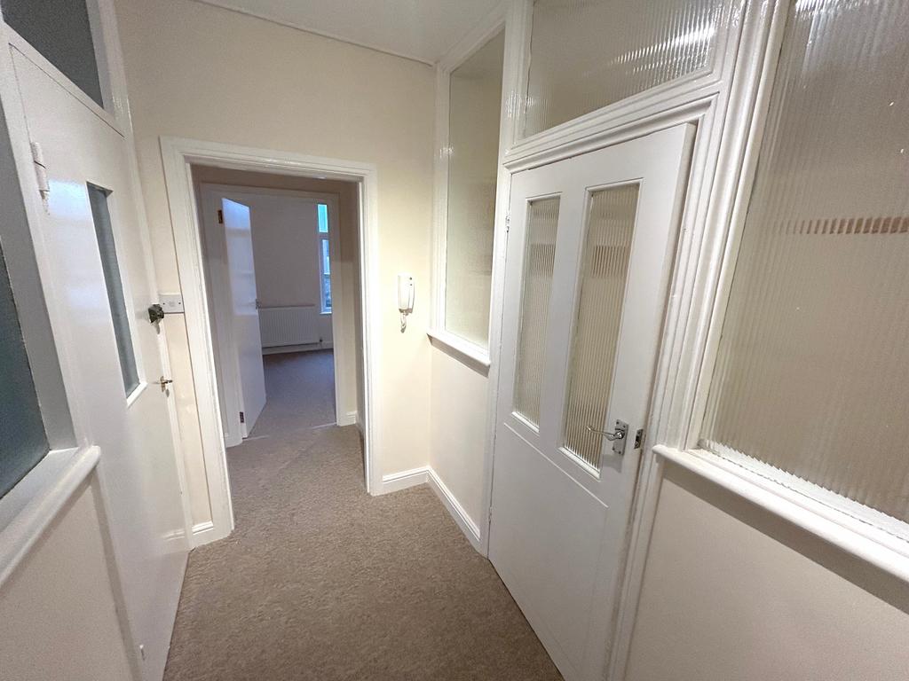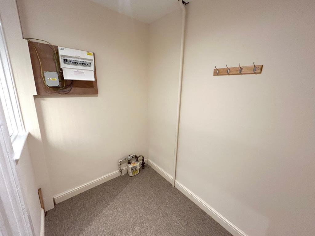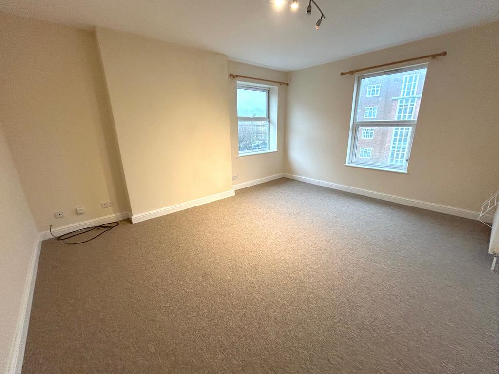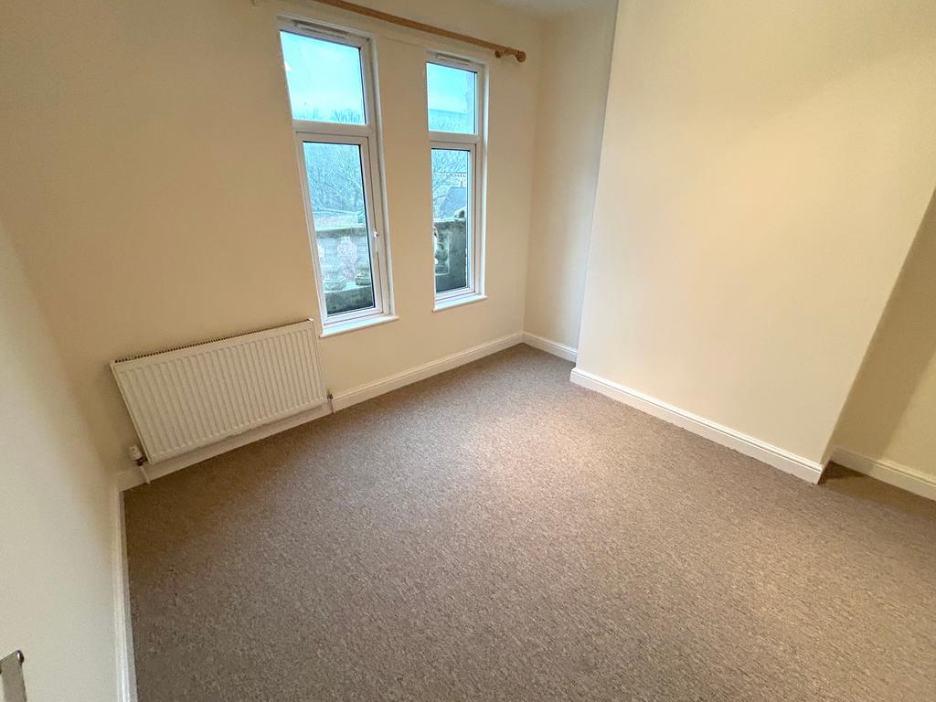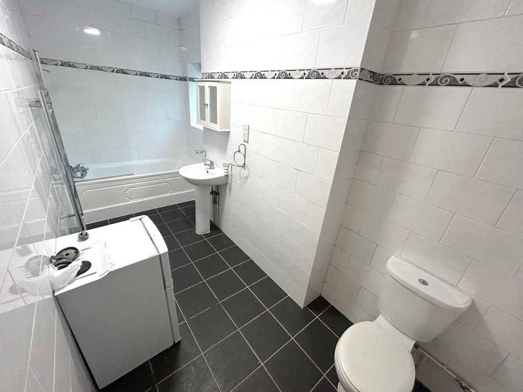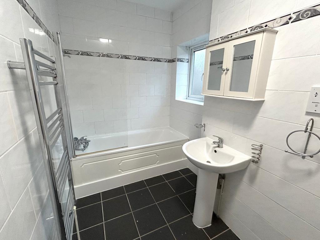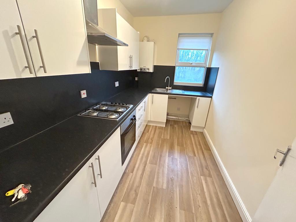 To the rear of the property, you will find a modern kitchen with sleek white cabinetry, dark contrasting worktops, an integrated oven and hob, and plumbing/space for additional appliances. A further well-proportioned double room is located to the rear, ensuring a quiet night's sleep and a surprisingly large and fully tiled bathroom featuring a white suite with a full-size bath and shower over, a pedestal wash basin, and a heated towel rail.