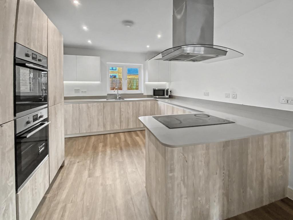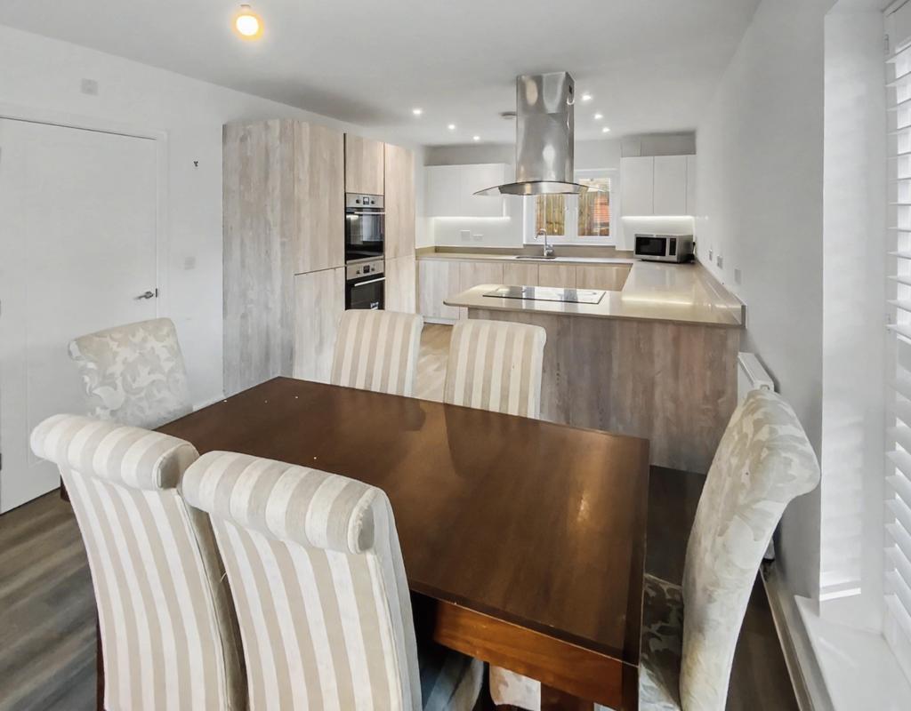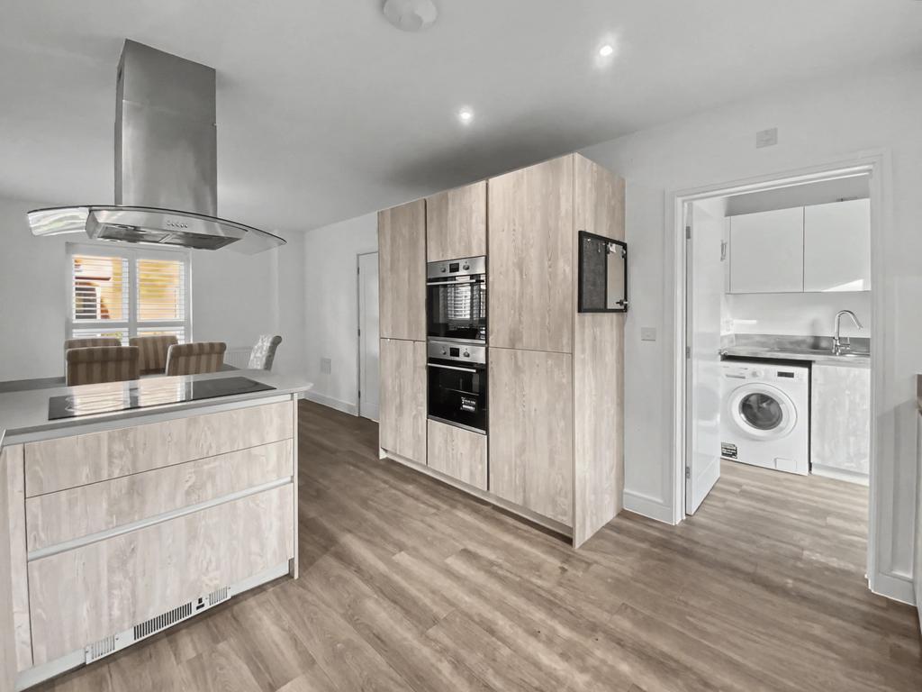 The heart of the home is the stunning kitchen/dining room, fitted to a high specification with pristine quartz worktops, integrated double ovens, stylish cabinetry, and an expansive central breakfast bar with a sleek extractor hood—ideal for both casual breakfasts and entertaining guests. LVT flooring runs through from the entrance & cloakroom, to kitchen/diner, blending style and durability. Adjoining the kitchen is a separate utility room, ideal for laundry and extra storage.