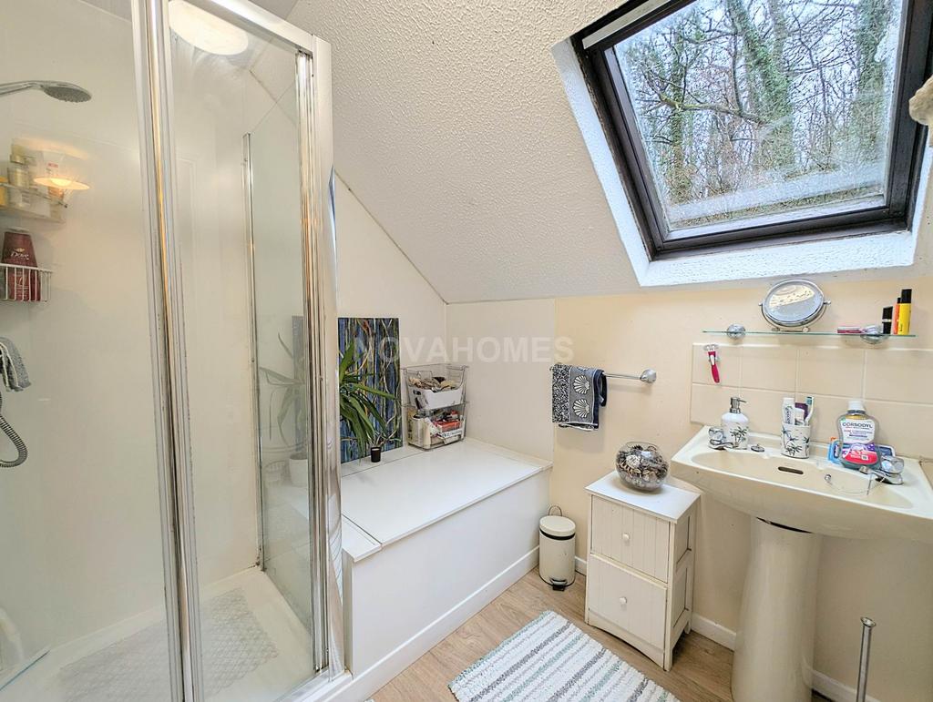 Fitted with three piece suite comprising shower enclosure with fitted shower above, pedestal wash hand basin with tiled splashbacks and low-level WC, hardwood double glazed Velux window to the rear, heated towel rail.