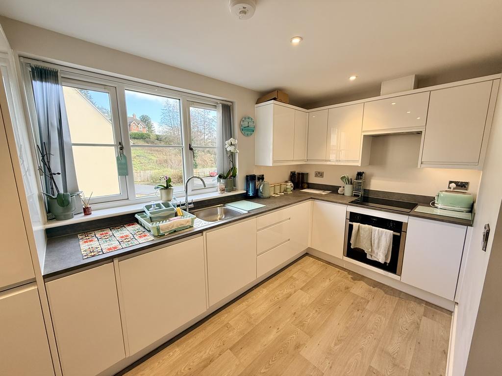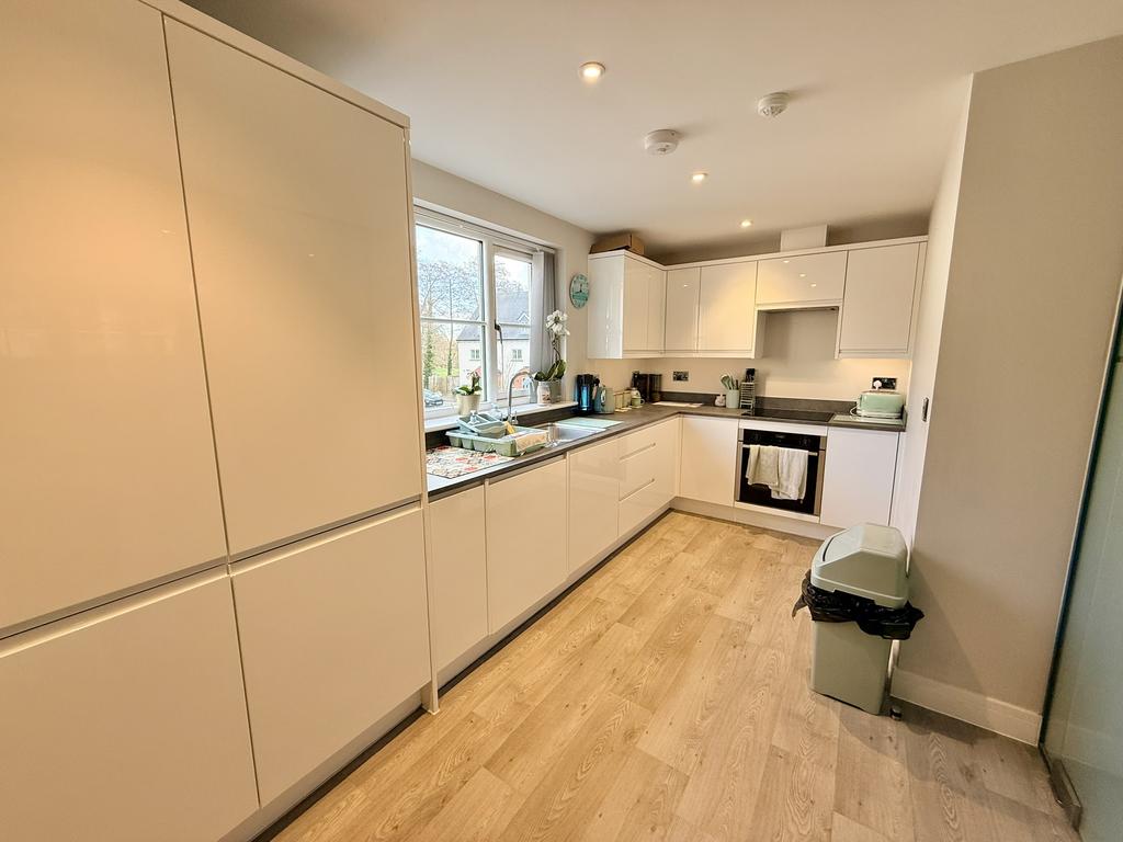 Fitted with a range of stylish wall and floor mounted units with complementary roll edge working surface over. Inset stainless steel bowl sink and drainer, wood effect flooring, double glazed window to front aspect. Integrated dishwasher and fridge/freezer, single door electric oven with halogen hob and extractor hood over, radiator.