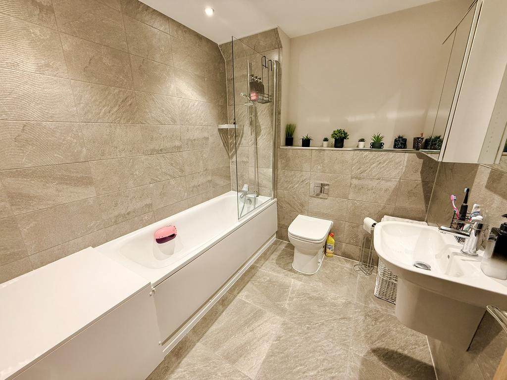 Stylish bathroom fitted with a white suite comprising panelled bath with shower attachment and glass screen, close coupled WC and wall hung wash hand basin. Tiled flooring and part tiled walls, chrome heated towel rail, extractor fan.