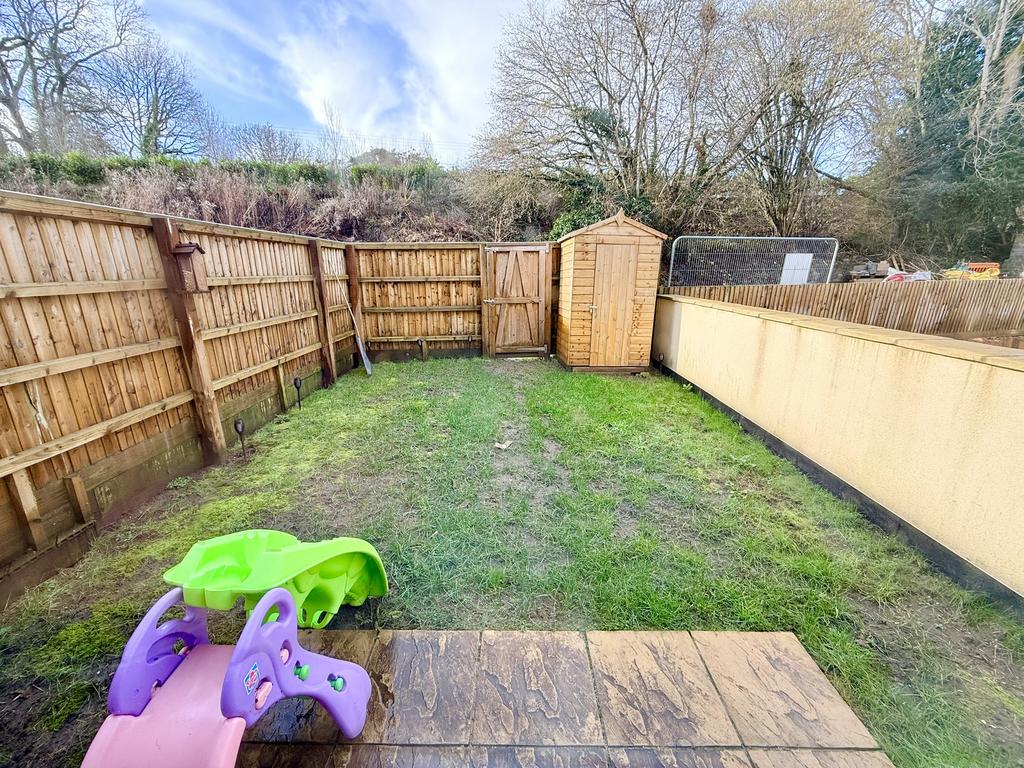 Laid mainly to lawn with a small paved seating area, garden shed.