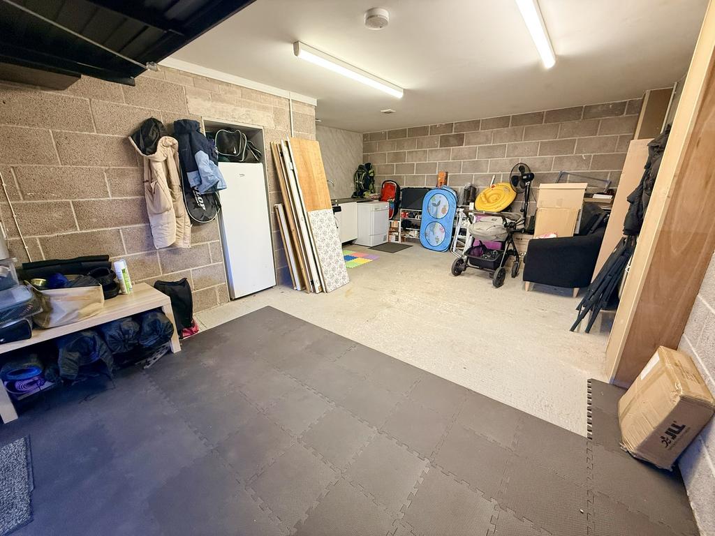 A paved driveway at the front of the property leads to a large integrated garage, which includes lighting and power. The garage features a utility area with fitted cupboards, worktop space and plumbing for both a washing machine and tumble dryer.