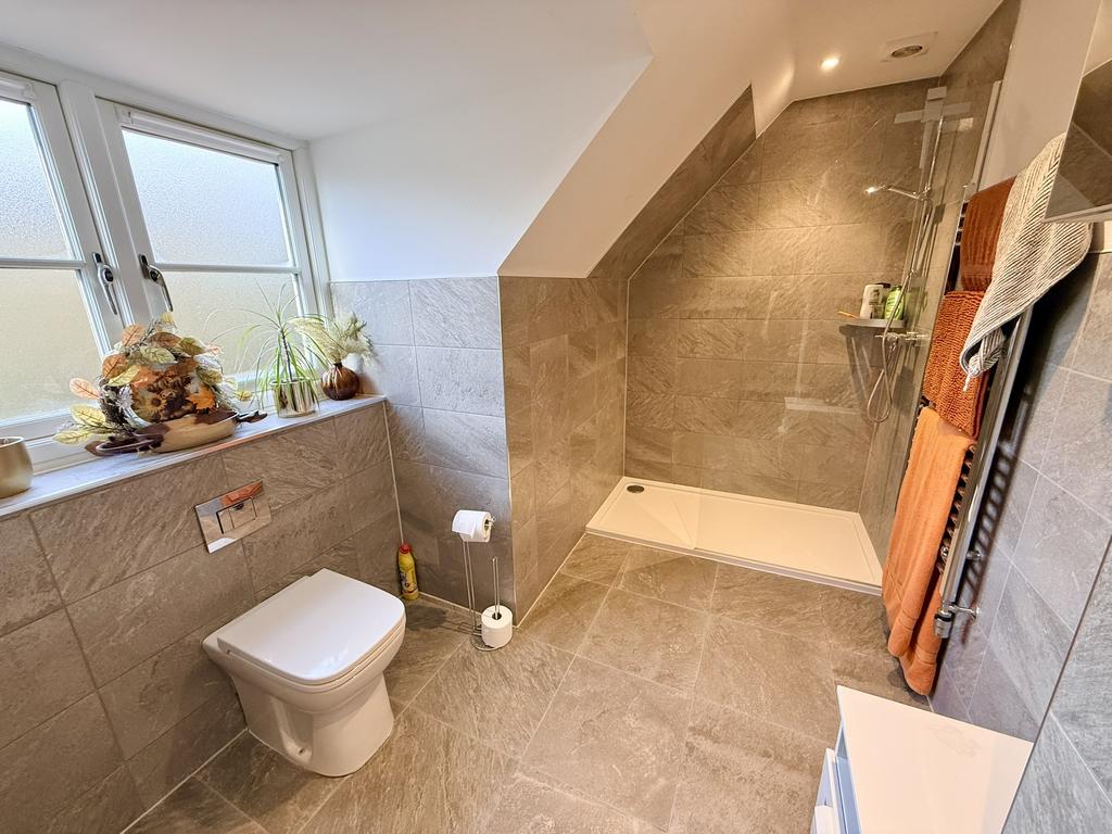 Stylish shower room fitted with a white suite comprising large walk-in shower enclosure with glass partition, close coupled WC and wall hung wash hand basin. Tiled flooring and part tiled walls, chrome heated towel rail, extractor fan, double glazed window to rear aspect.