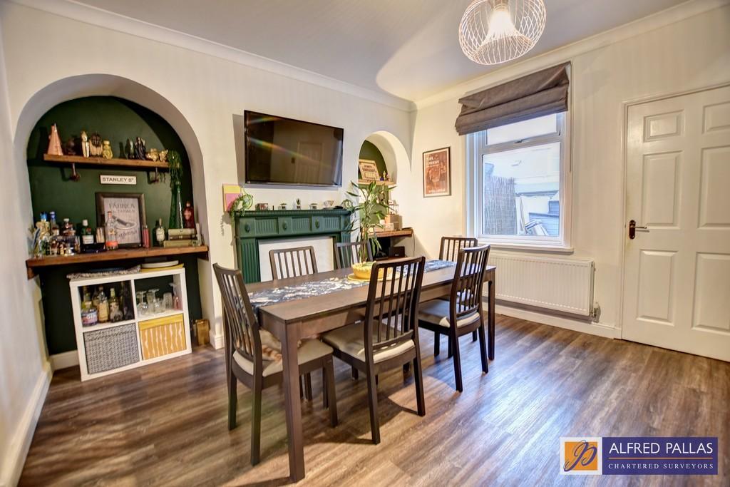 DINING ROOM 12' 11" x 14' 11" (3.95m x 4.56m to chimney breast) Feature fireplace with marble inset and hearth; shelves to alcoves; stairs to first floor; laminate floor; radiator