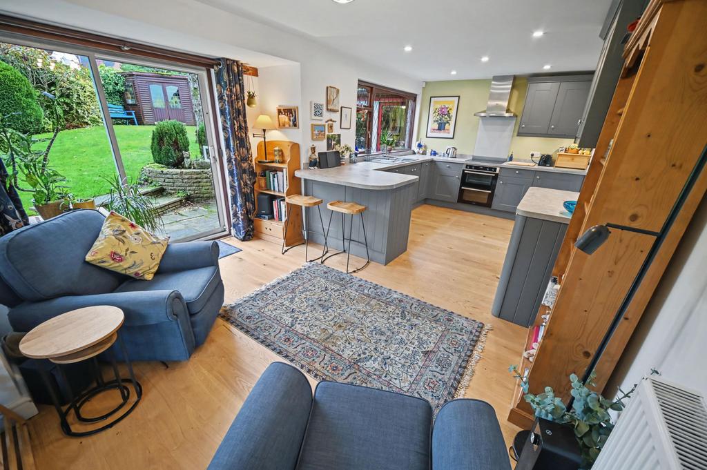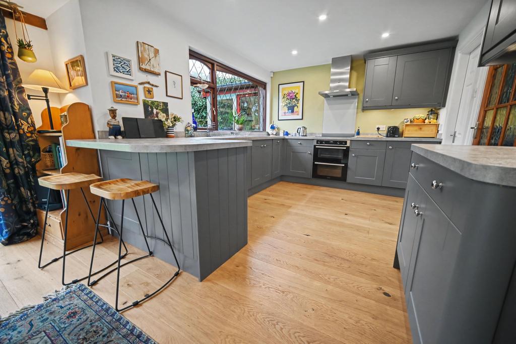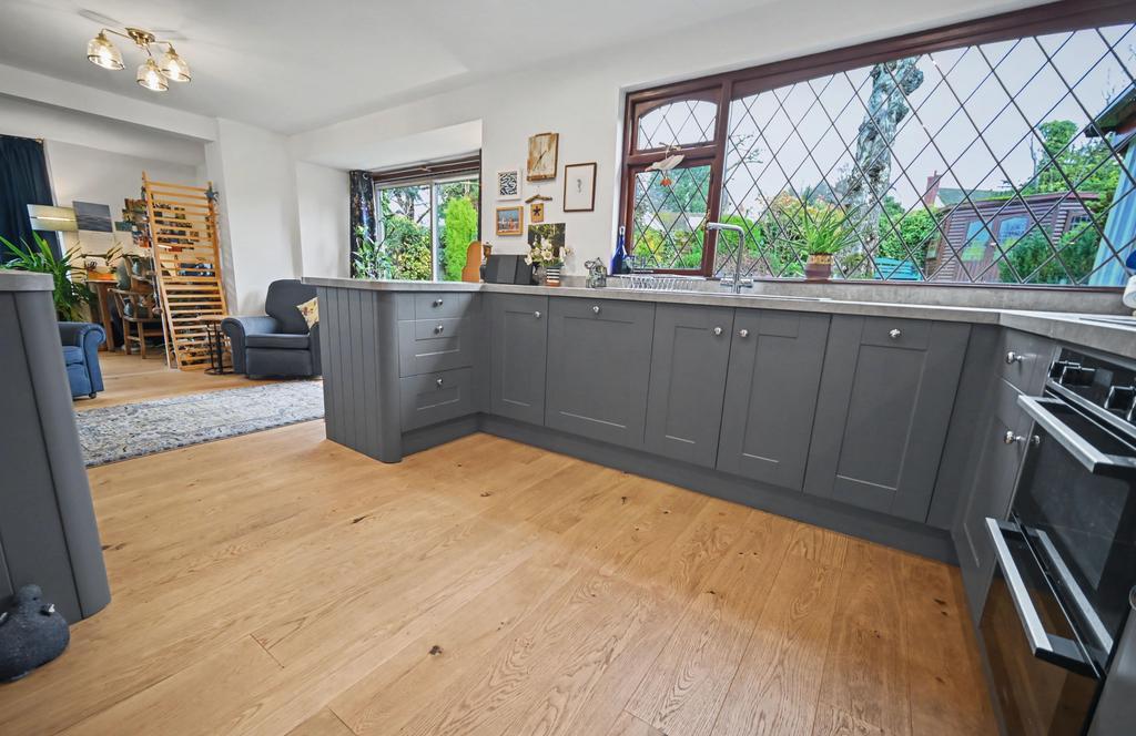 Breakfast Kitchen: 20’1’’ (6.11m) x 10’7’’ (3.23m) Fitted with a contemporary grey shaker style suite comprising a range of base cupboards, drawers & suspended wall cupboards, stone effect laminate worktops, grey composite 1.5 drainer sink unit with chrome mixer tap, built in appliances include fridge, dishwasher, electric oven & 4-ring electric hob with stainless steel extractor hood over, radiator, recessed ceiling spot lights, oak style LVT flooring and hardwood double glazed leaded window to rear with patio doors.