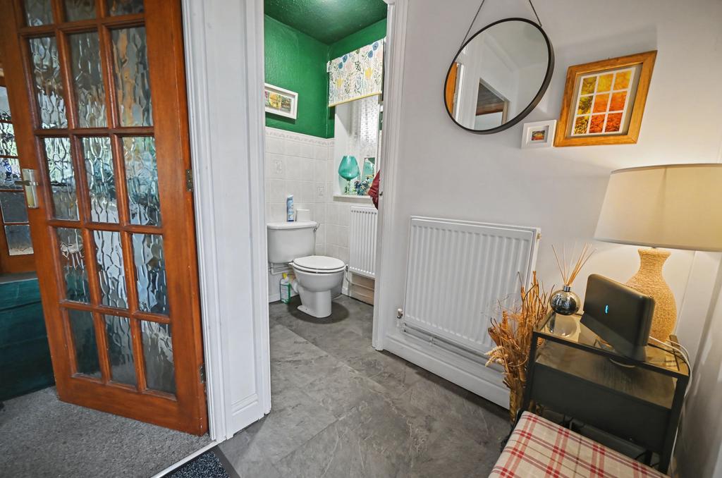 Guest Cloakroom: Fitted with a white low level WC & sink unit, radiator, part tiled walls, cloaks recess, extractor fan, slate style LVT flooring and internal opaque glazed window to side.