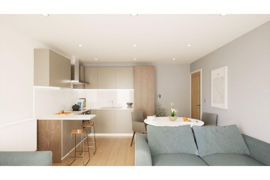 This newly built apartment offers modern living with high-quality finishes throughout. The kitchen features contemporary handleless cabinets, high-quality worktops, matching upstands & splashbacks, a stainless steel integral sink, induction hob, and LED strip lighting under the wall units, creating a sleek and functional cooking space.