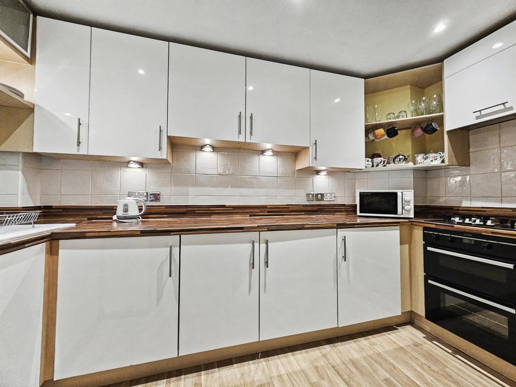 KITCHEN (3.5m x 1.4m approx)(12'4" x 4'5" approx) with laminated floor, range of built-in units; including laminate worktops with tiled surrounds, floor cupboards, (including drawers) wall cupboards, and wine rack. Composite one and a half sink unit, integrated four ring gas hob with oven below, and built-in fridge and freezer.