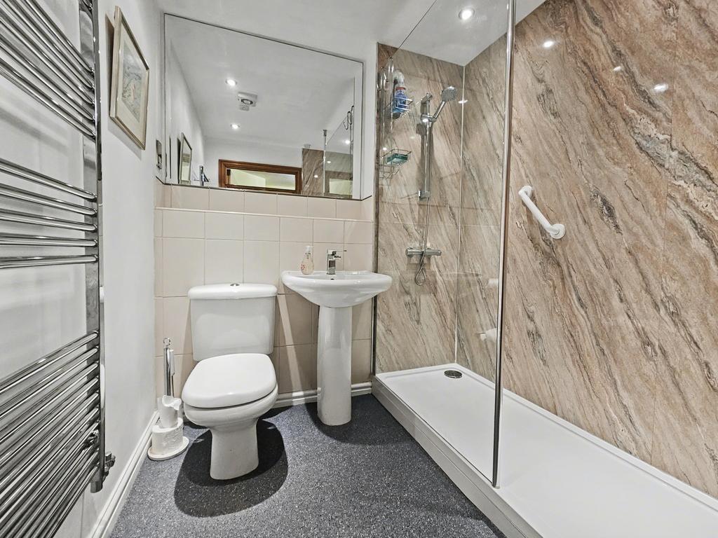 SHOWER ROOM with tiled floor, part tiled walls, white suite with splashback panels, walk in shower, WC, and washbasin. Wall mirror, shaver point, heated towel rail, and extractor fan.