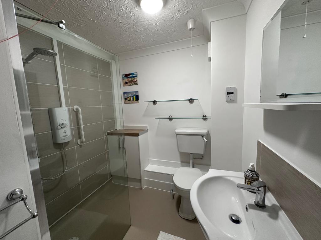 SHOWER ROOM: - Electric power shower, Low level WC, wall mounted sink, cupboard with mirror, part-tiled walls, coved ceiling, extractor fan, shaver point.