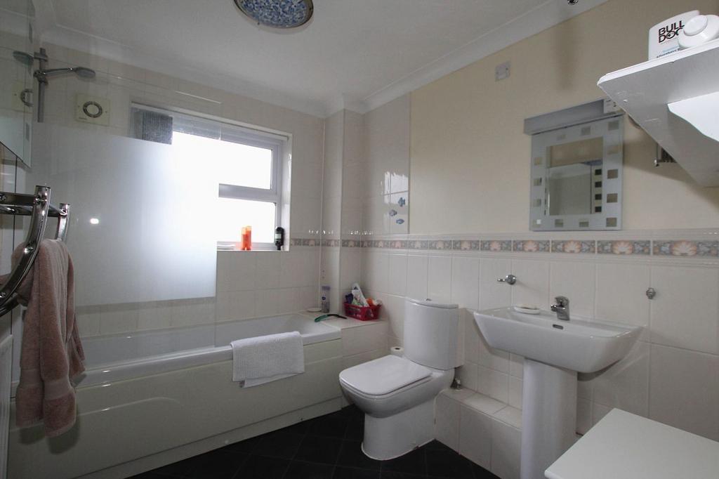 Family Bathroom: Obscure window to rear elevation, part tiled walls complimenting white suite comprising low level WC, pedestal wash hand basin panelled bath with mixer tap and shower attachment over, extractor fan, radiator.