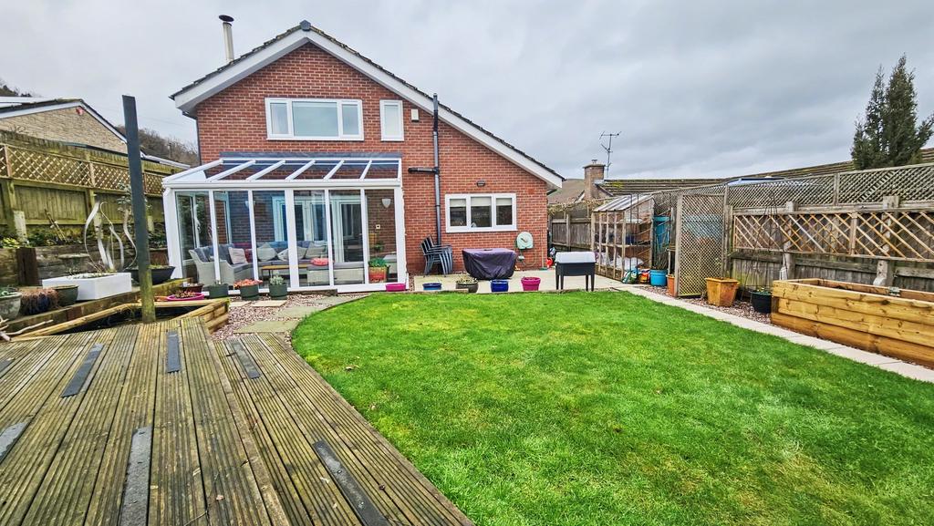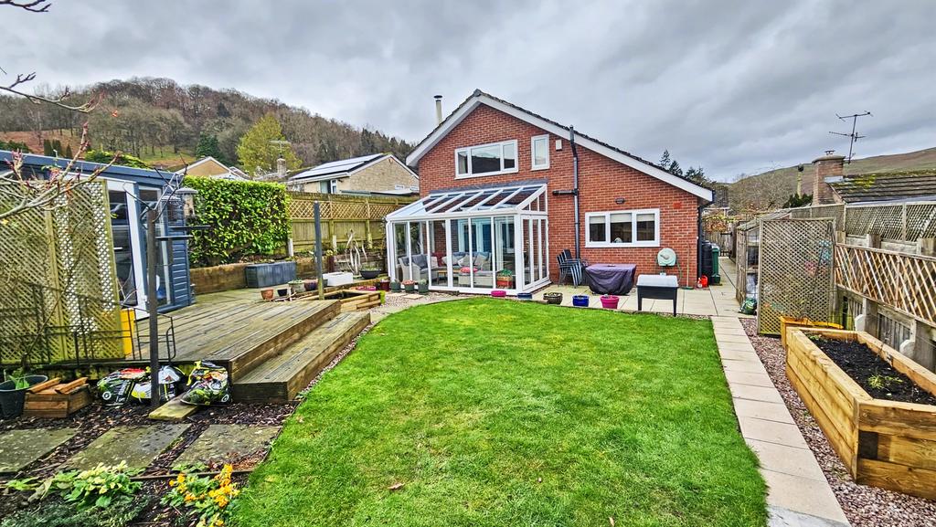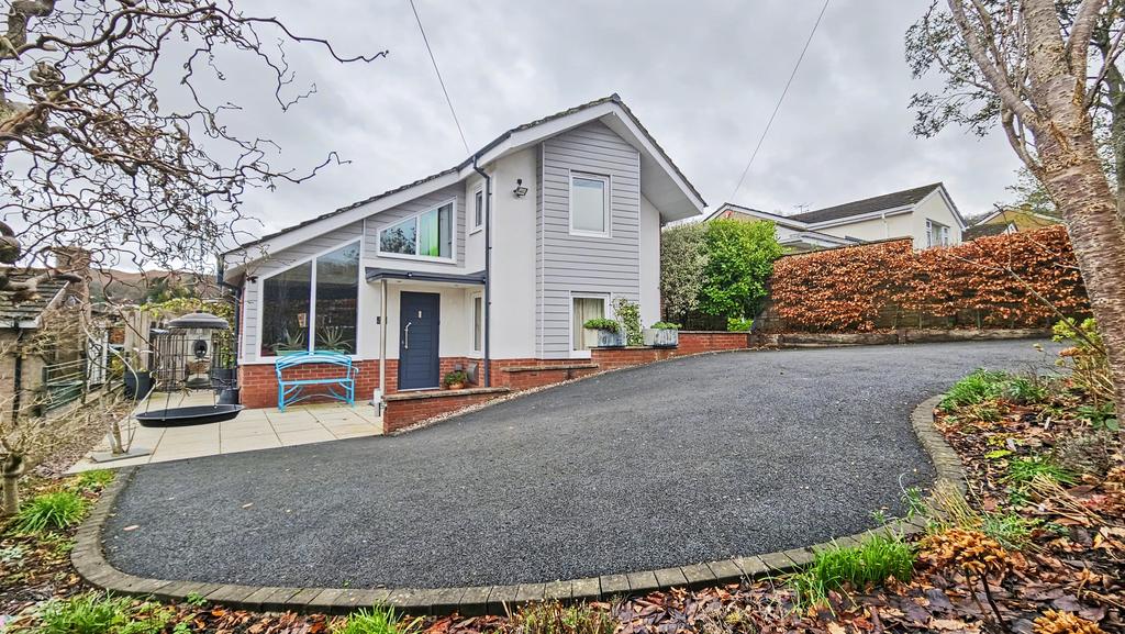 The property is approached over a tarmac driveway providing ample off road parking. There are floral borders and trees with paths leading to the rear garden, which enjoys superb views, patio areas, lawn, raised beds, potting shed, and a summerhouse.